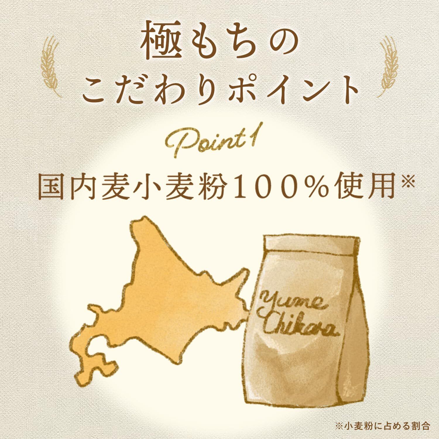 もちもち食感のゆめちからから作った小麦粉を配合することで、もっちりとした食感を叶えました。※小麦粉に占める割合