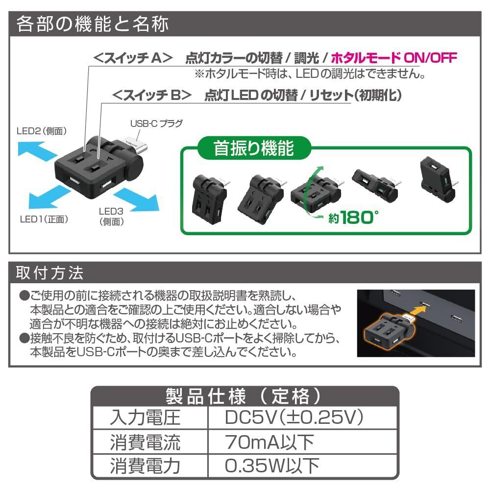 ライト部の角度調整ができる首振りLEDライト、3つのLEDを搭載。首振り機構でUSB-C電源から離れた暗い場所も狙って照らせる。8色の単色固定、グラデーション、蛍モードなどの光り方が選べる。