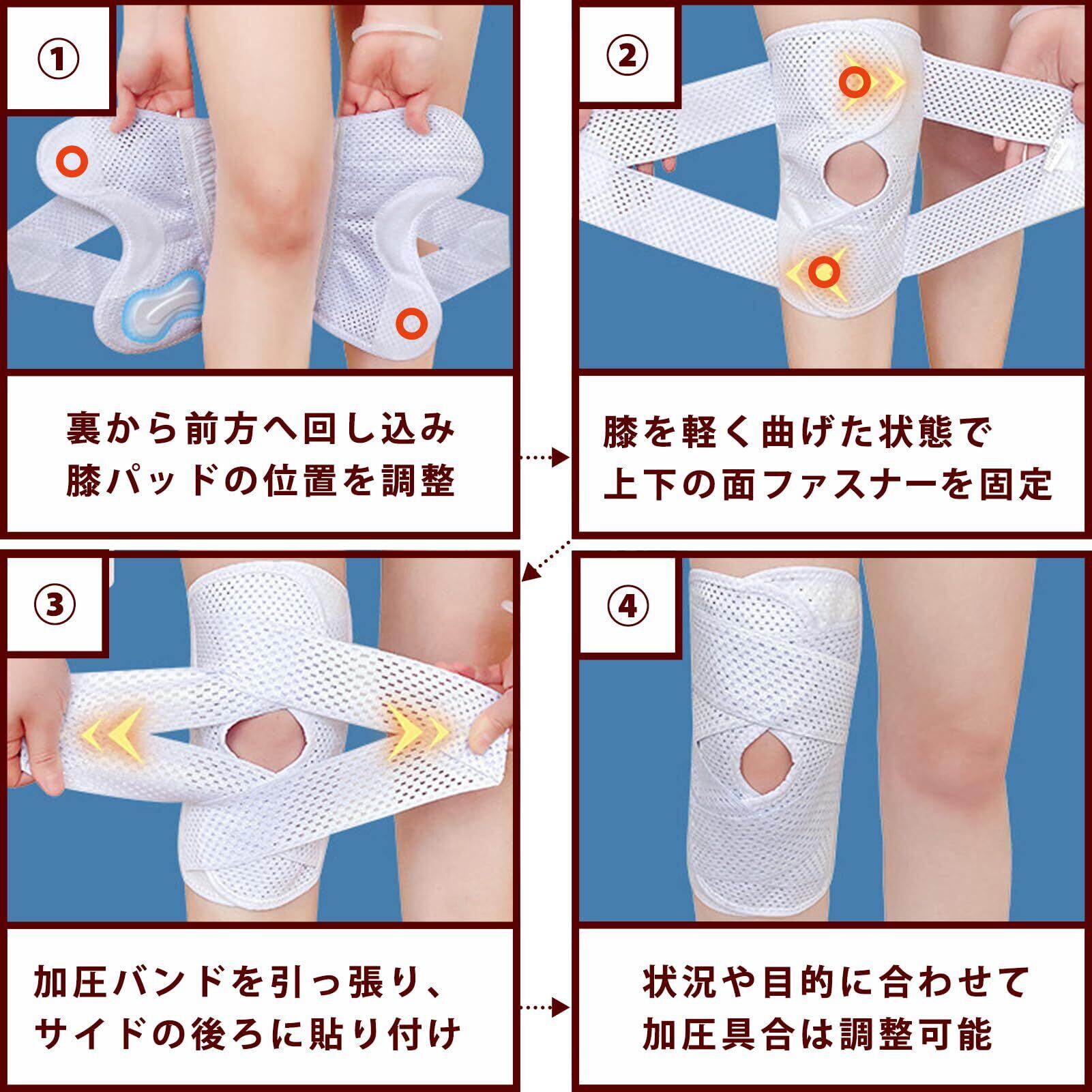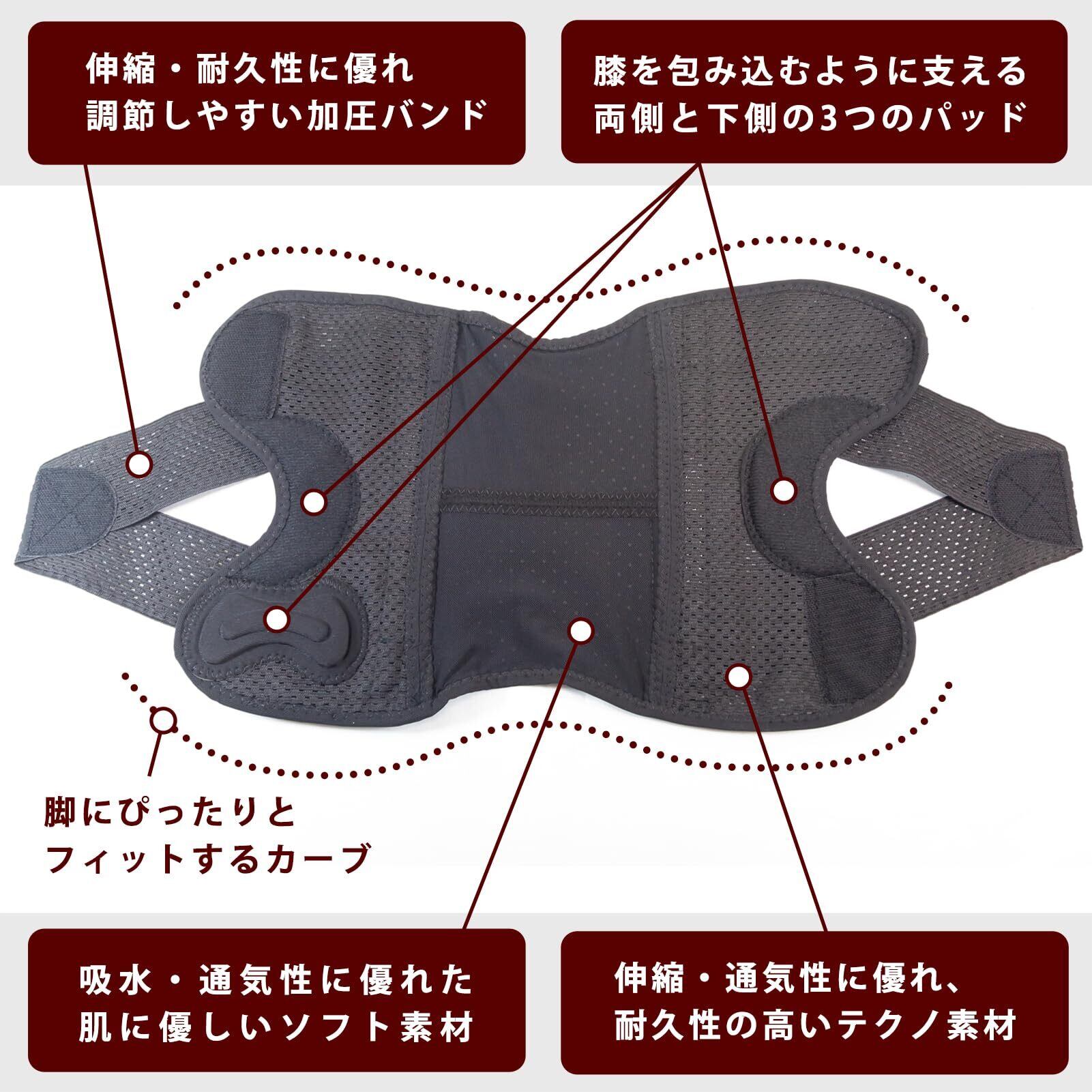 【商品概要】伸縮性のあるバンドで締めるタイプの膝サポーター(膝下のパッドが配置された改訂版)です。左右共通タイプで、バンドの加圧具合はご自身で調整可能。性別、年代を問わず、日常生活においてはもちろん、激しいサポーツをする際にもご使用いただけます。
