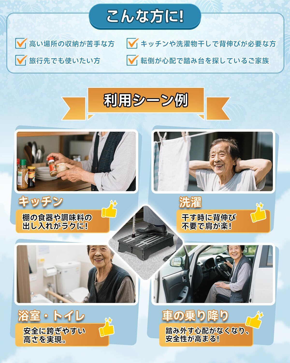 【多目的利用】高い段差や車の乗り降り、洗車時や足場として幅広く活用できます。足の置き場には滑り止めが付いているので安心してご使用いただけます。