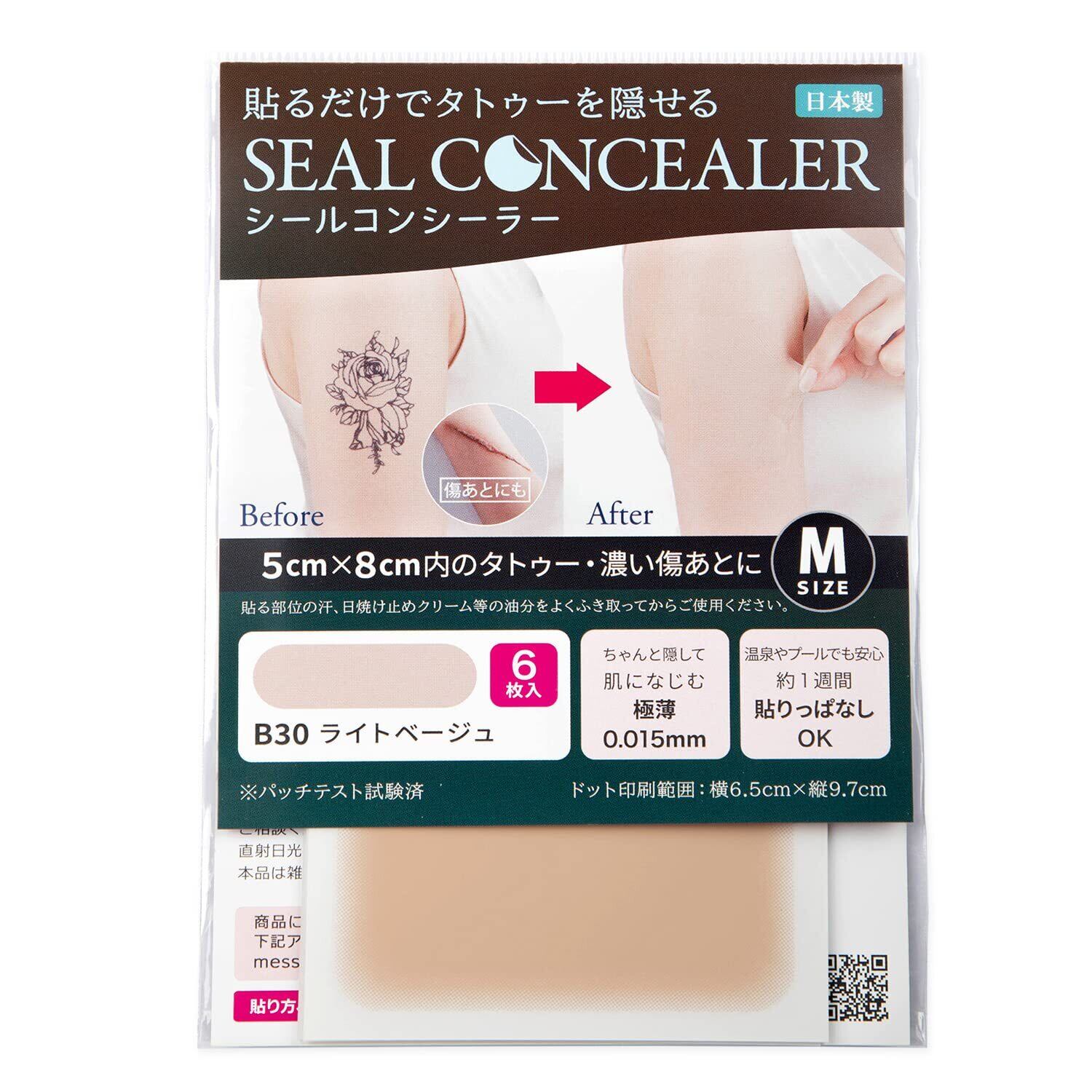 [クラッセ]タトゥー隠し専用 シールコンシーラー しっかり隠せる タトゥー 傷跡 アザ 貼るタイプ 日本製 貼りっぱなしOK 極薄0.015㎜ テカらない 汗水に強い( B30ライト Mサイズ 6枚入り)
