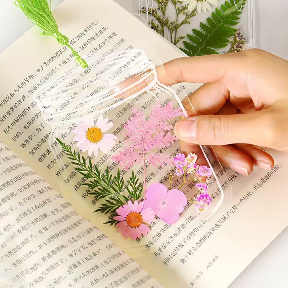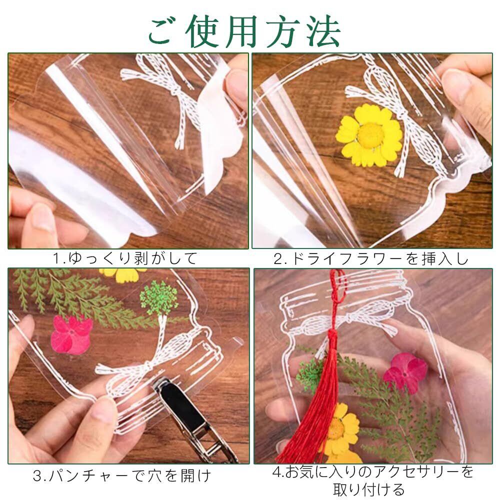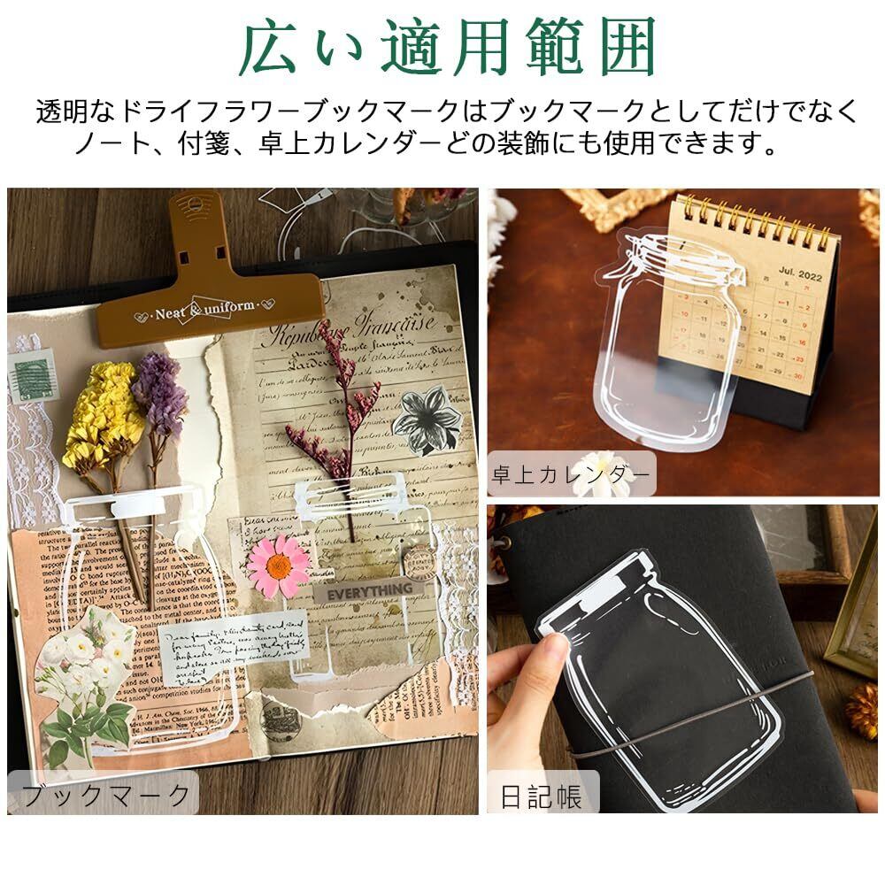 【適用範囲】透明なドライフラワーブックマークはブックマークとしてだけでなく、ノート、パソコン、携帯電話、付箋、卓上カレンダー、マグカップなどの装飾にも使用できます。パンチャーで穴を開け、お好みの房飾りパーツを取り付ければ、完成後はお部屋や車内に吊るすのに最適です。