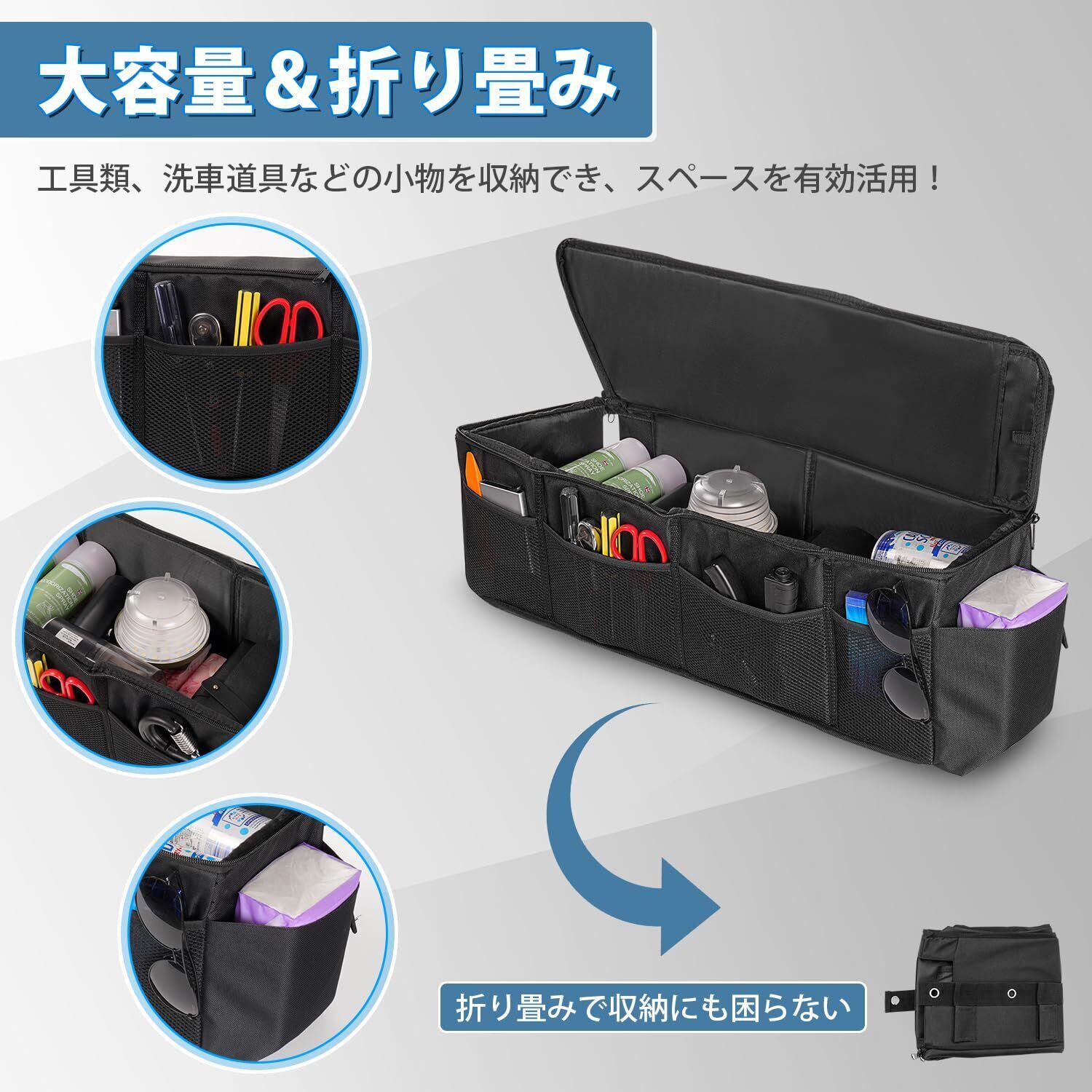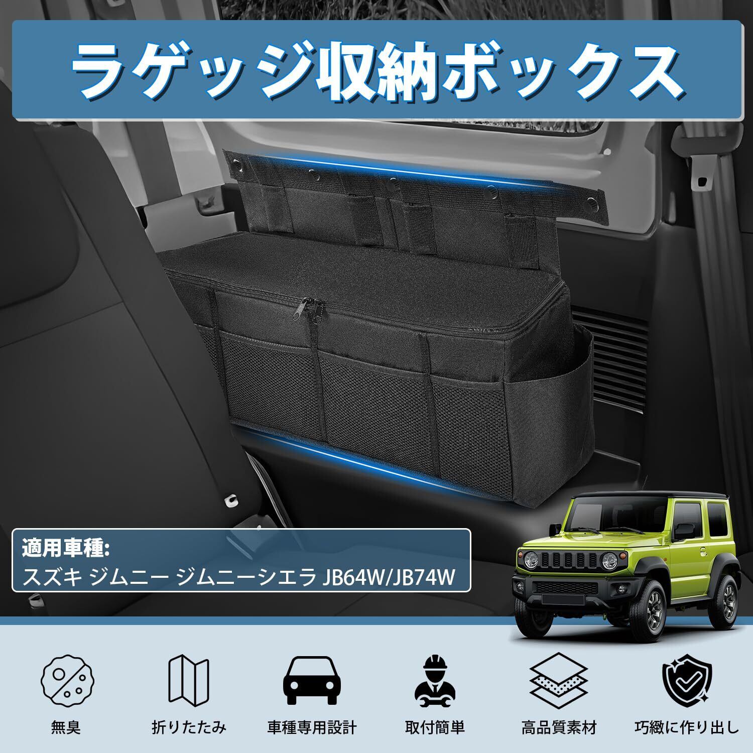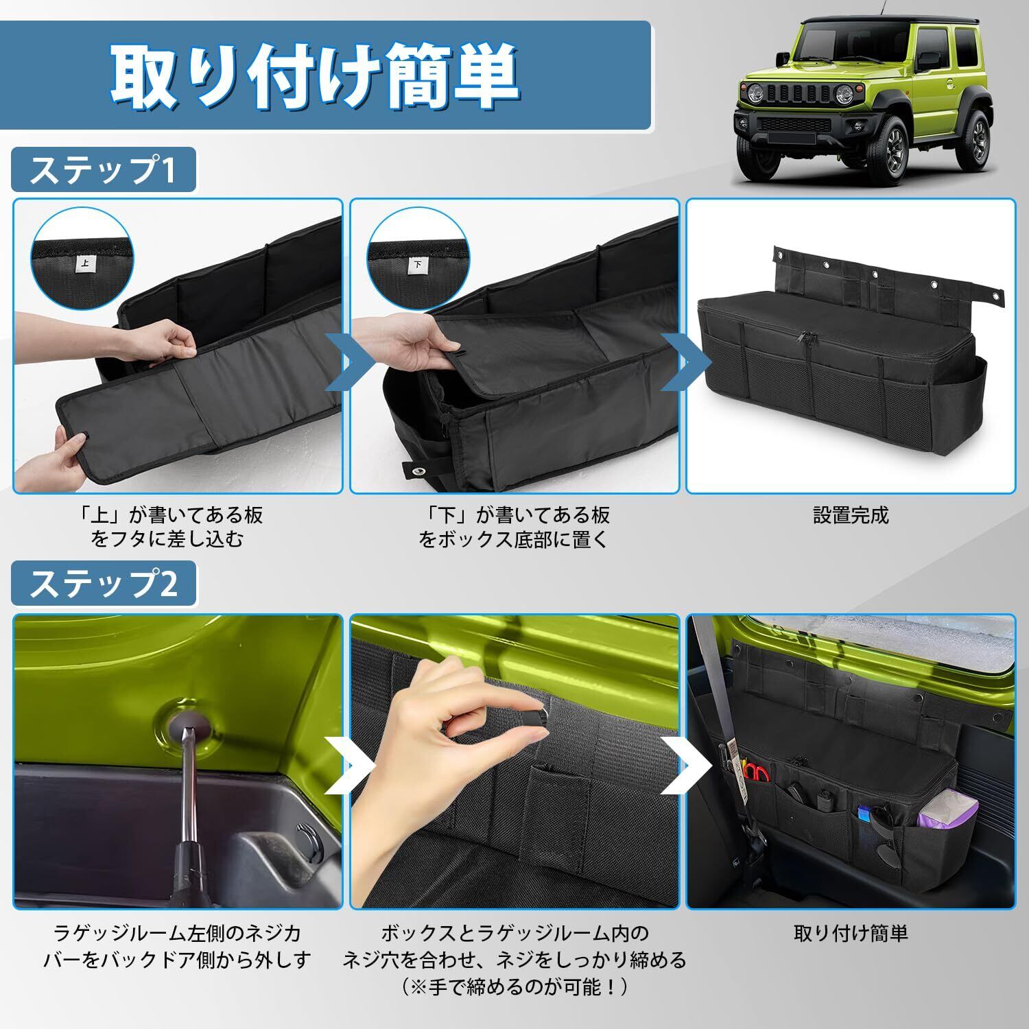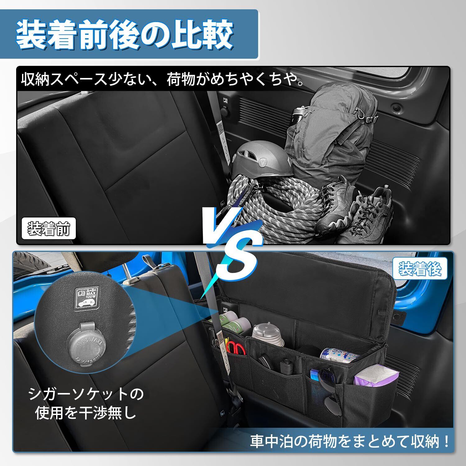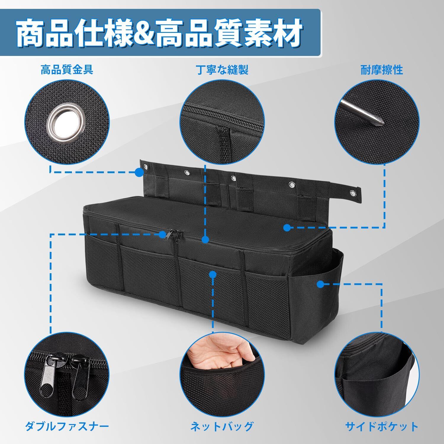 2.【スペース分け&使いやすい】:ダブルファスナー仕様で開閉しやすく、荷物などを持ち上げて収納に役立ちます。また、外側にはツール収納用のポケット、ジャンプスターター、工具類、洗車道具、タオルケット、ランタンなどの小物を収納でき、ジムニーの限られたスペースを有効活用!
