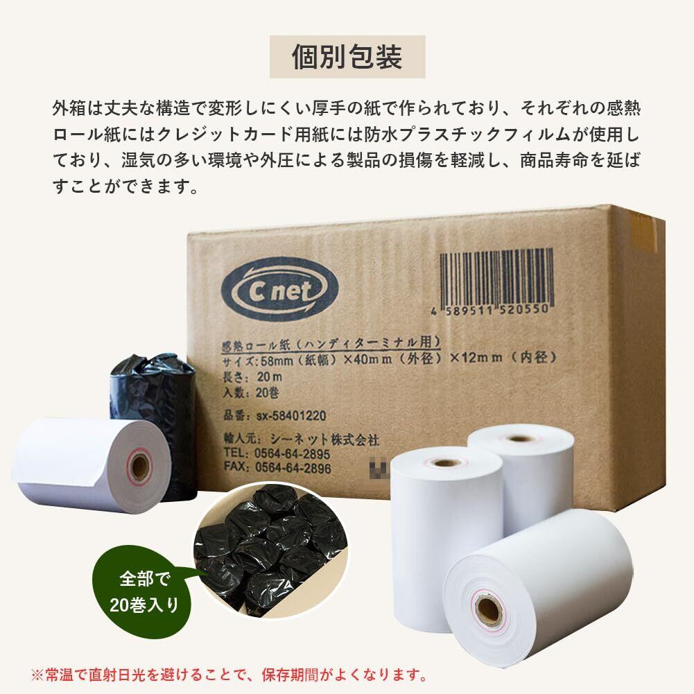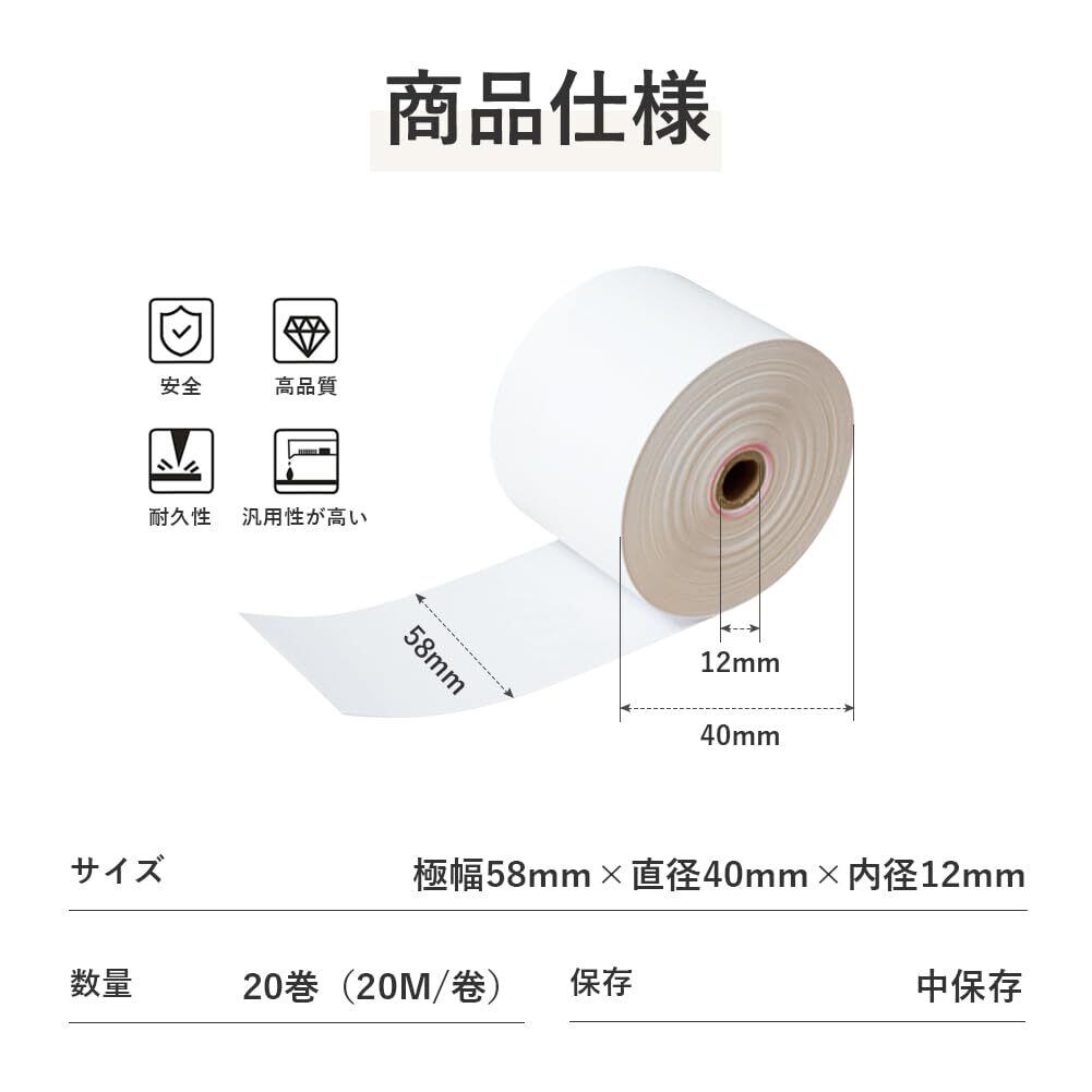 【商品仕様】感熱ロール紙サイズ:幅58mm×外径40mm×内径12mm 20巻入、紙の厚さ:65μです。