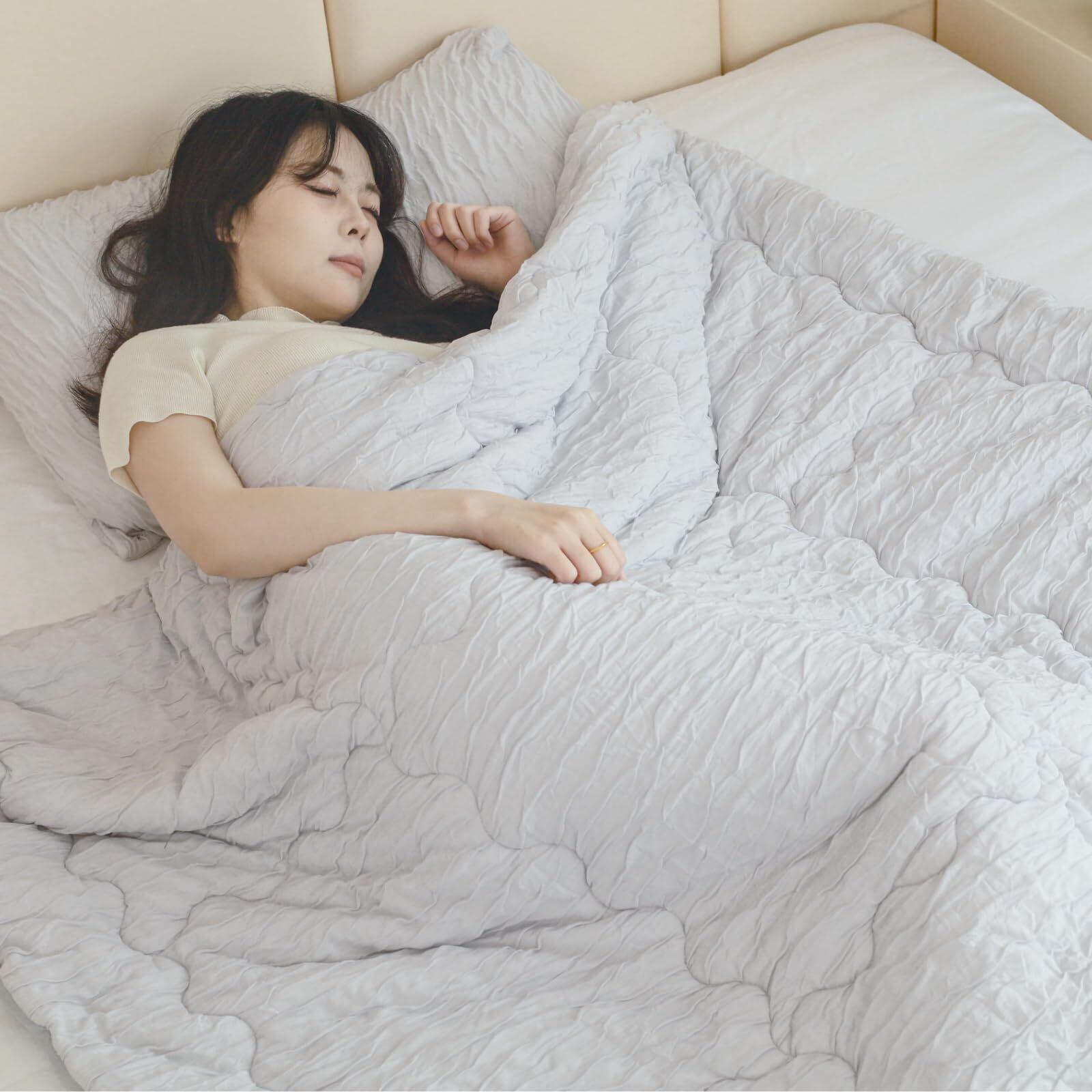 【除湿速乾&丸洗い可能】夏の寝苦しさの原因は温度だけでなく湿気も。VERILADYは特別な除湿速乾加工を施し、ムレを素早く解消。寝汗をかいてもサラッと快適な寝心地が持続します。 さらに、キルティング加工で中綿の偏りを防ぎ、ふっくら感を長期間キープ。 ご家庭での丸洗いも可能で、清潔を保ちながら冷感効果もそのまま持続します。