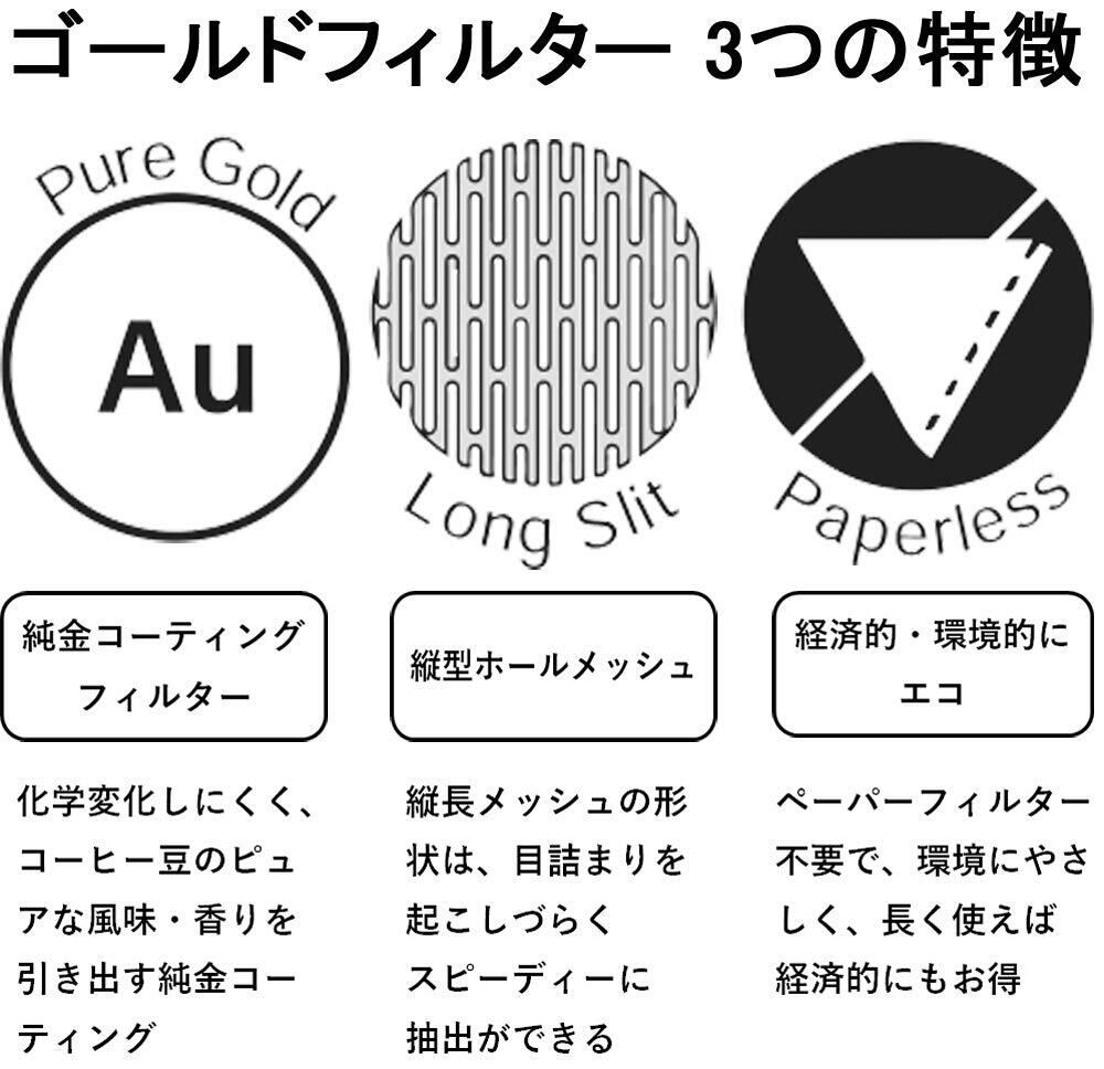 フィルターの素材はゴールドを使用。コーヒー劣化の原因の一つである酸化に対して強い金属の為、味と香りに対して最も影響が少ないフィルター