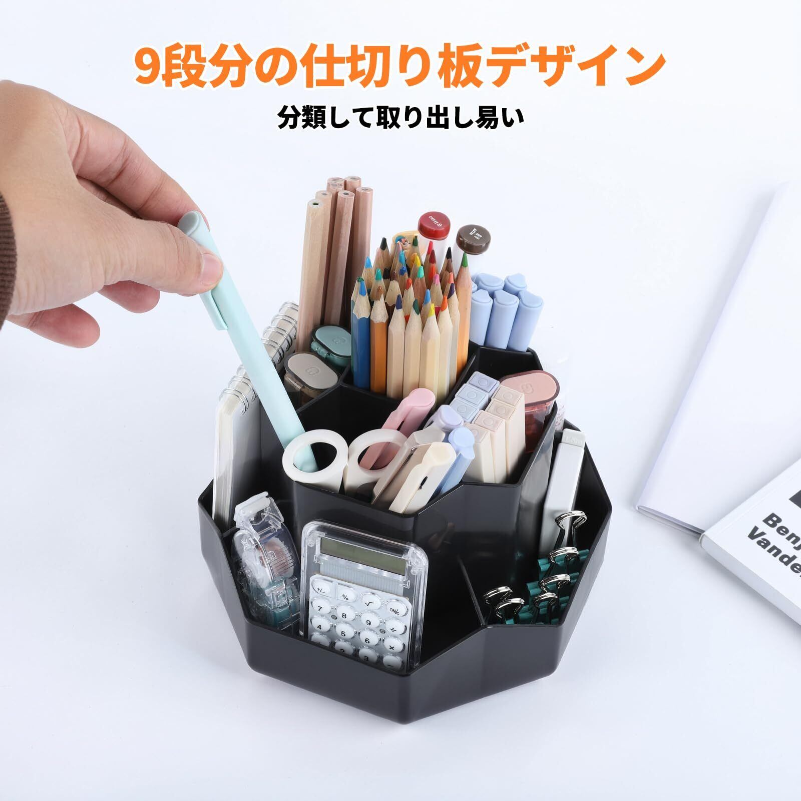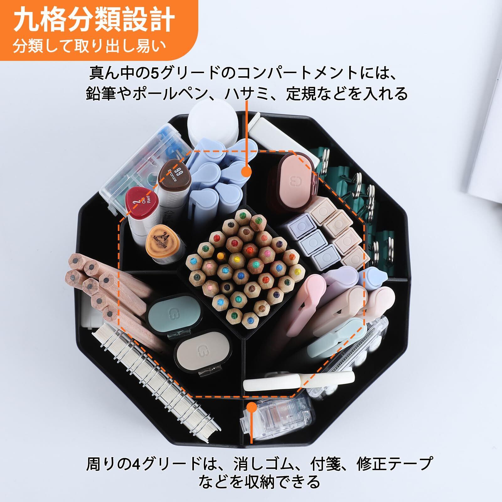 【実用性と機能性】:大容量な仕切りデザイン、9格の収納ボックスがあり、ペン、鉛筆、マーカー、定規、消しゴム、ペーパークリッパなどの文房具を簡単に分類して収納できます。テーブル上小物の整理整頓は効率的です。中央の5つの独立したコンパートメントに鉛筆を150本以上収納可能、周囲の4つ独立したコンパートメント、消しゴムやクリップ、追加の文房具などの整理に便利。デスクトップをすっきりとした状態に保ちます。