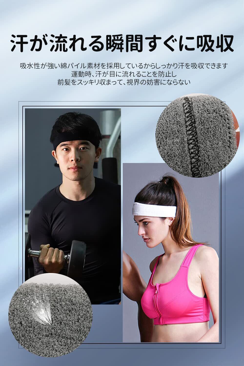 【ソフトで快適な着心地】パイル地でタオルと同じような素材は肌に優しいです。皮膚への刺激はほとんどないので、敏感肌の方でもお使い頂けます。重さを感じないほど軽量な素材で、長時間着用しても頭への負担になりません。さらに、通気性が優れていて、吸収した汗を外にどんどん散発され、サラッとした使用感を維持してくれます。