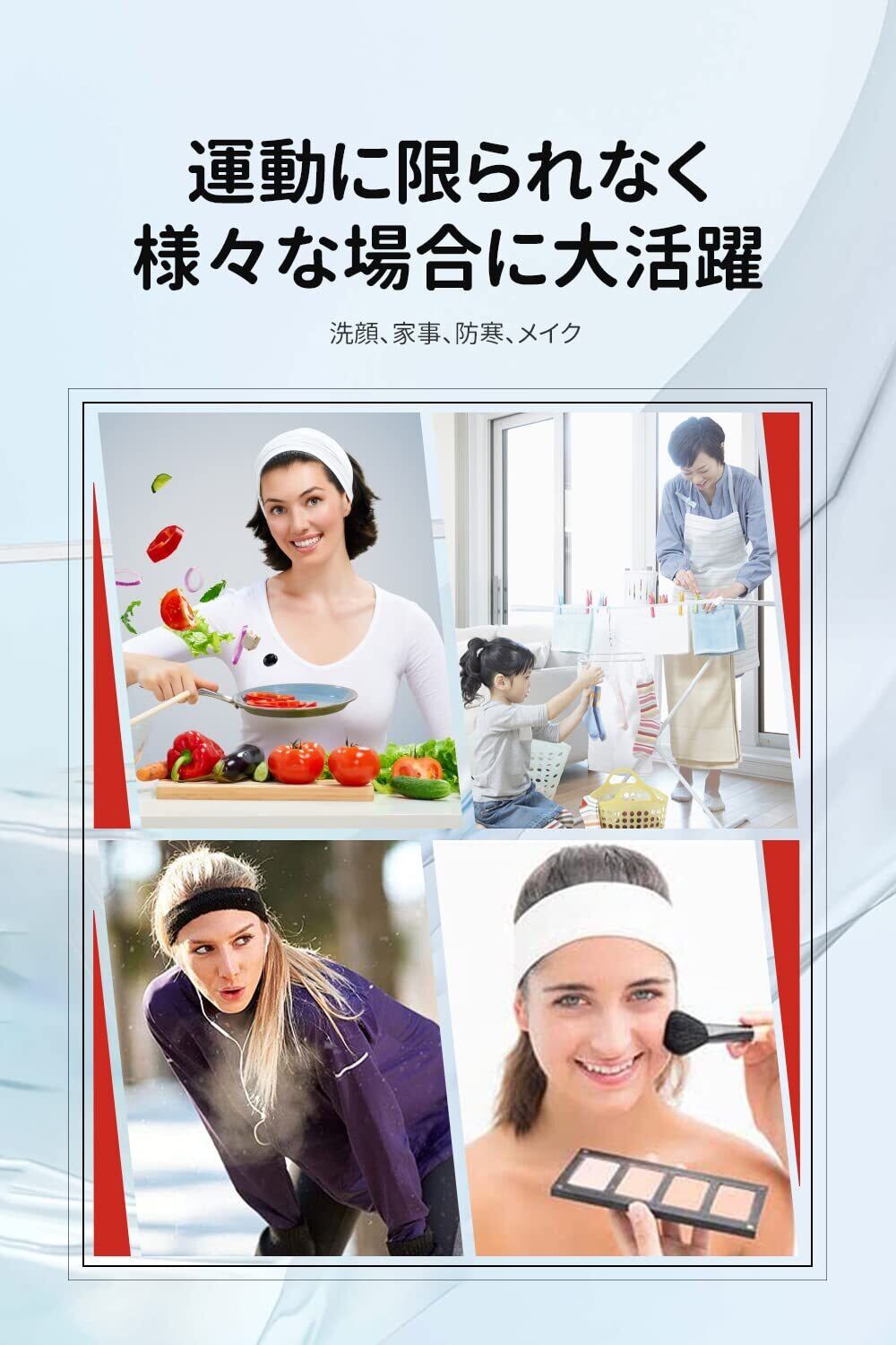 【スポーツ用だけではない】伸縮性と吸水性の両方とも兼ね備えているヘッドバンドは、ヨガ、釣り、ジョギングなどの軽い運動でのお使いはもちろん、滑りにくい特性もあり、ハイキング、サイクリング、野球などの激しい運動でも大丈夫です。散らかった髪を管理することができるから、日々の洗顔、家事、メイク、料理等のシーンに活躍しています。