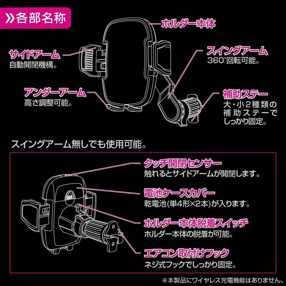 スマホを置くだけでオートホールド。タッチ開閉センサーに軽く触れるだけでスマホを取外し。スイングアームで360°回転。見やすく、エアコンをふさがず取付け出来ます。