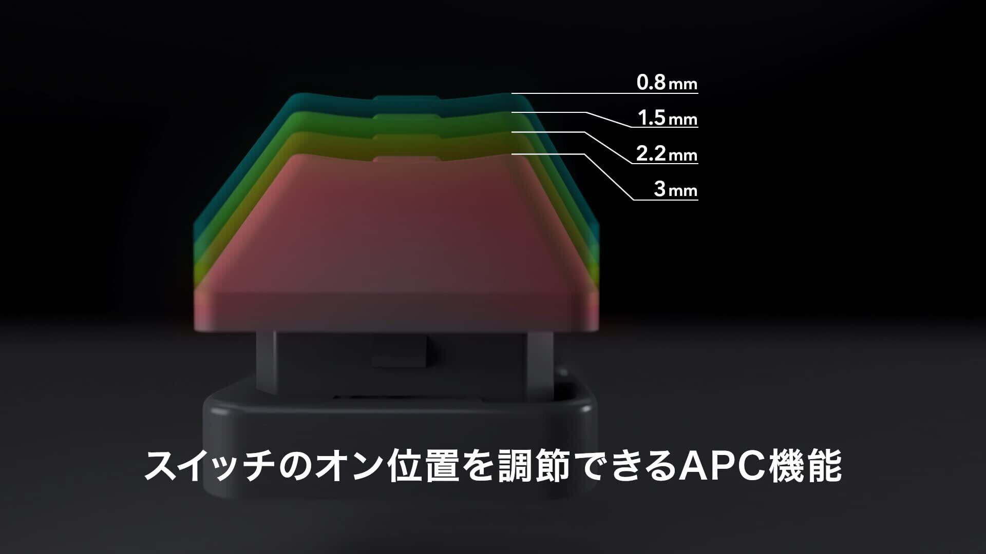 【APC機能】 キーのオン位置を0.8、1.5、2.2、3mm の4 段階で調節可能。様々なシーンに合わせて設定することが可能です。