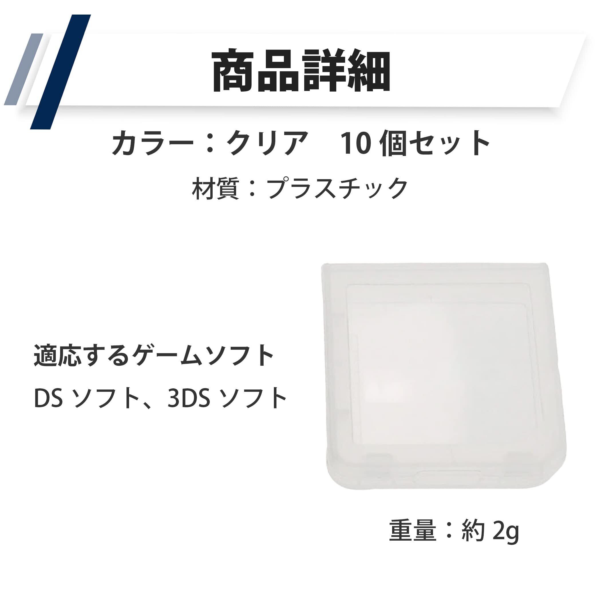 セット内容:10個セット カラー:クリア 材質:プラスチック 適応するゲームソフト:DSソフト、3DSソフト 重量:約2g ※モニターの環境等により、色の見え方に若干差が生じる場合がございます。