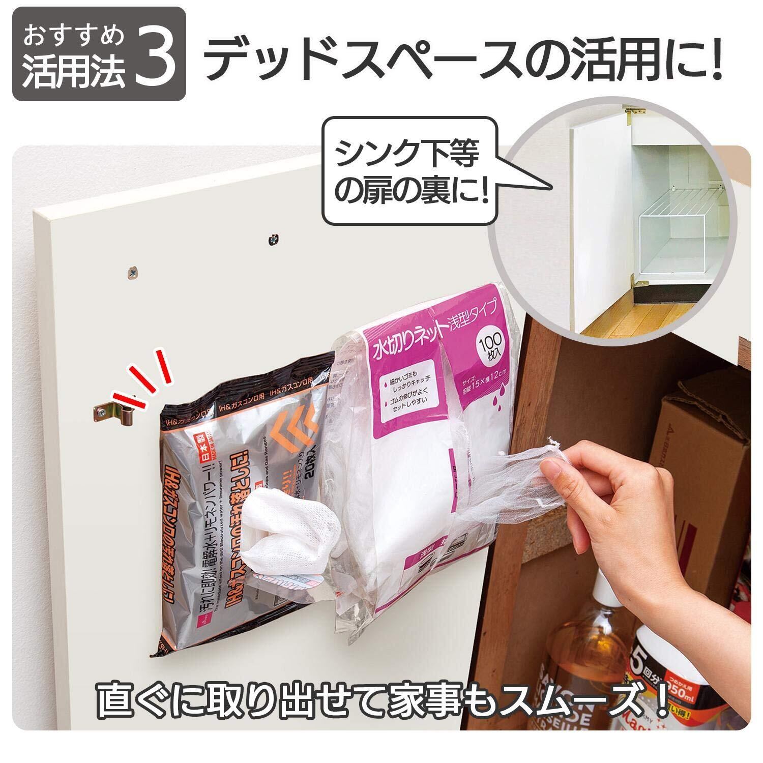 シンク下などの扉裏に、使用頻度の高い日用品(水切りネット・ゴミ袋)などを貼り付けて直ぐに取り出せ、空間収納・家事もスムーズに。