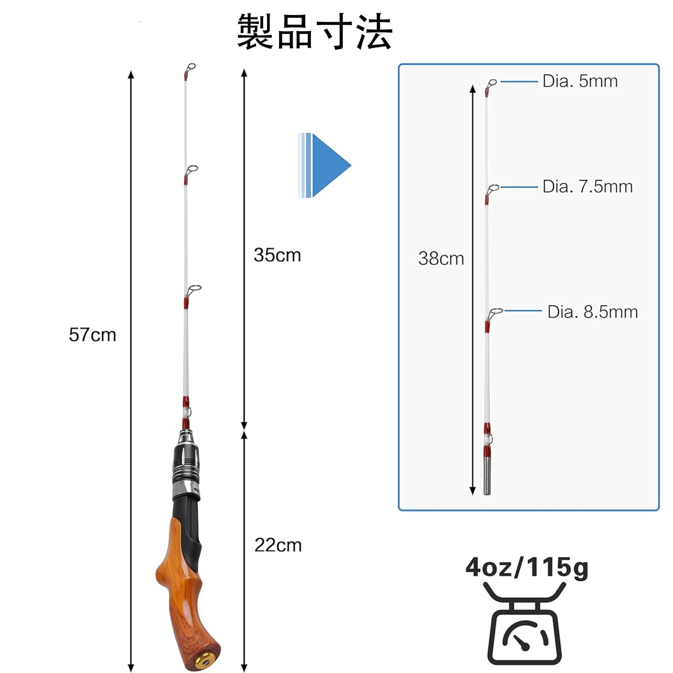 【仕様】仕舞寸法展開時全長約59cm、収納時約38cm。分割時:22cmハンドル部、約38cm元竿。標準自重:113g、継数:2、ガイド数:3+1。