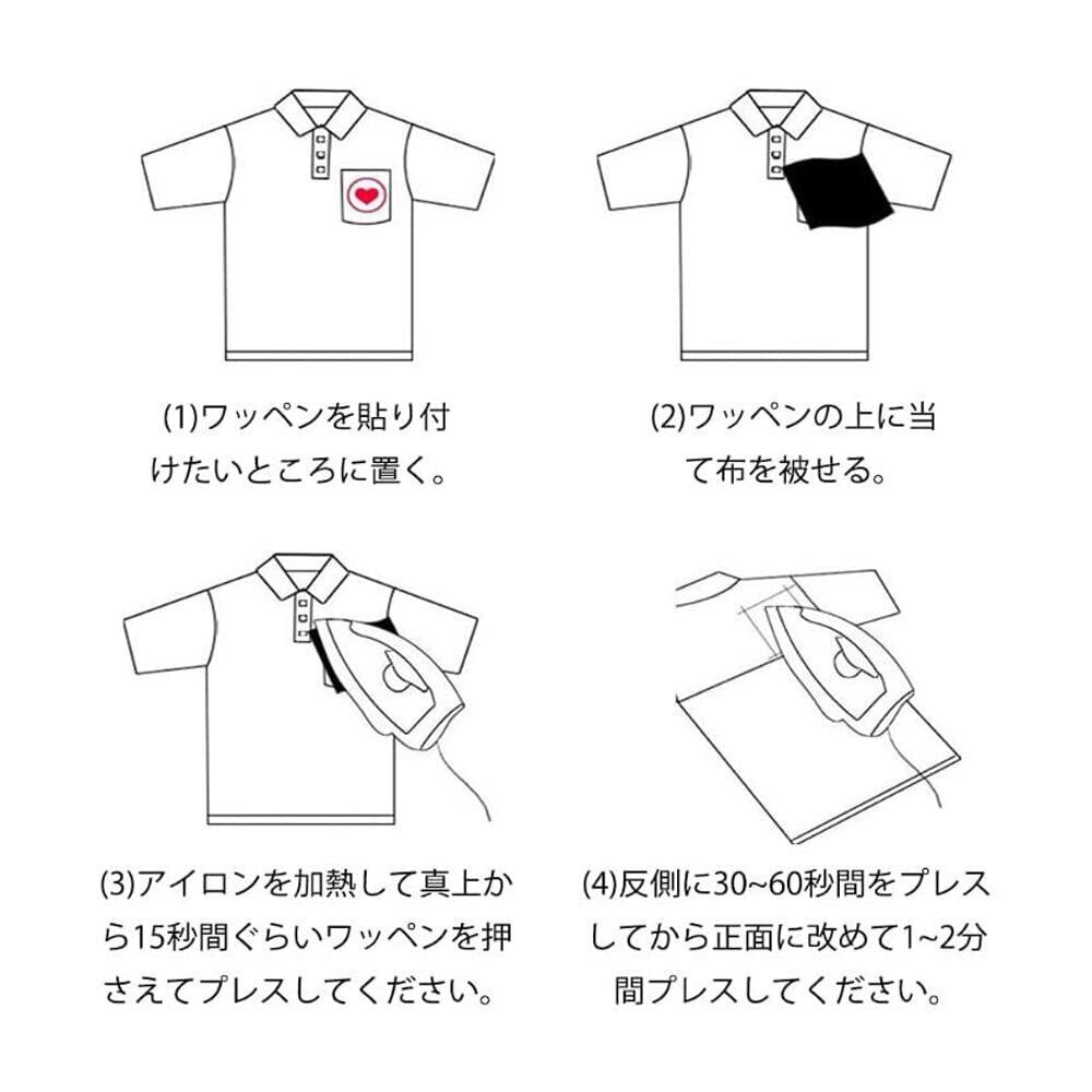 【使用方法】(1)ワッペンを貼り付けたいところに置く。(2)ワッペンの上に当て布を被せる。(3)アイロンを加熱して真上から15秒間ぐらいワッペンを押さえてプレスしてください。(4)反側に30~60秒間をプレスしてから正面に改めて1~2分間プレスしてください。