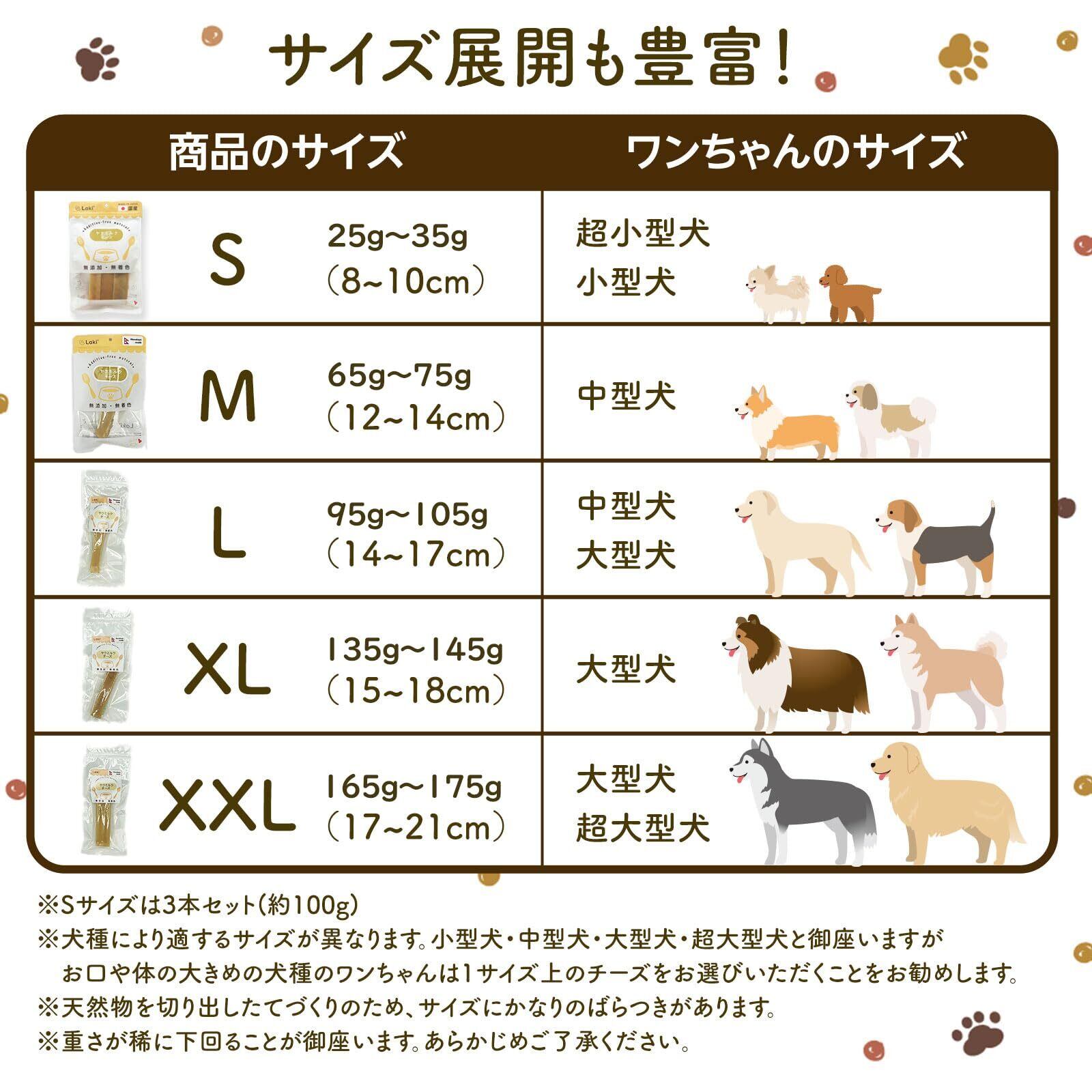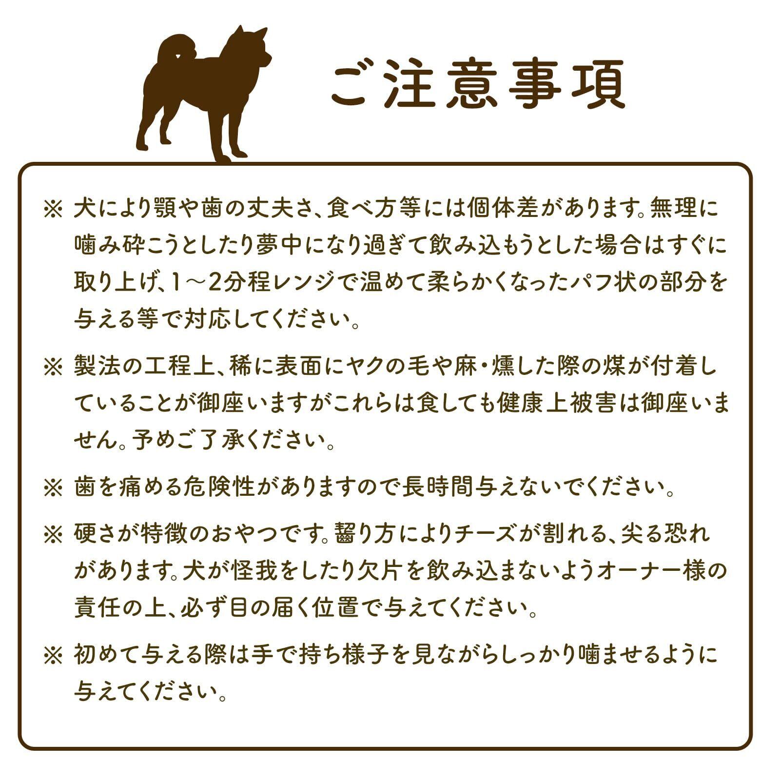 ●注意事項 ※必ず与える時間をお守りください※・目安は10分~15分程度です。それ以上与えると歯を痛める危険性が御座います。・犬により顎や歯の丈夫さ、食べ方等には個体差があります。無理に噛み砕こうとしたり夢中になり過ぎて飲み込もうとした場合はすぐに取り上げ、1~2分程レンジで温めて柔らかくなったパフ状の部分を与える等で対応してください。 ・製法の工程上、稀に表面にヤクの毛や麻・燻した際の煤が付着していることが御座いますがこれらは食しても健康上被害は御座いません。予めご了承ください。 ・歯を痛める危険性がありますので長時間与えないでください。 ・硬さが特徴のおやつです。齧り方によりチーズが割れる、尖る恐れがあります。犬が怪我をしたり欠片を飲み込まないようオーナー様の責任の上、必ず目の届く位置で与えてください。 ・初めて与える際は手で持ち様子を見ながらしっかり噛ませるように与えてください。※あまりに大きいと噛まなかったり、小さいと飲み込んでしまう恐れがあります。必ず画像内の表を参考にワンちゃんのお口や体のサイズに合ったものをお選び下さい。