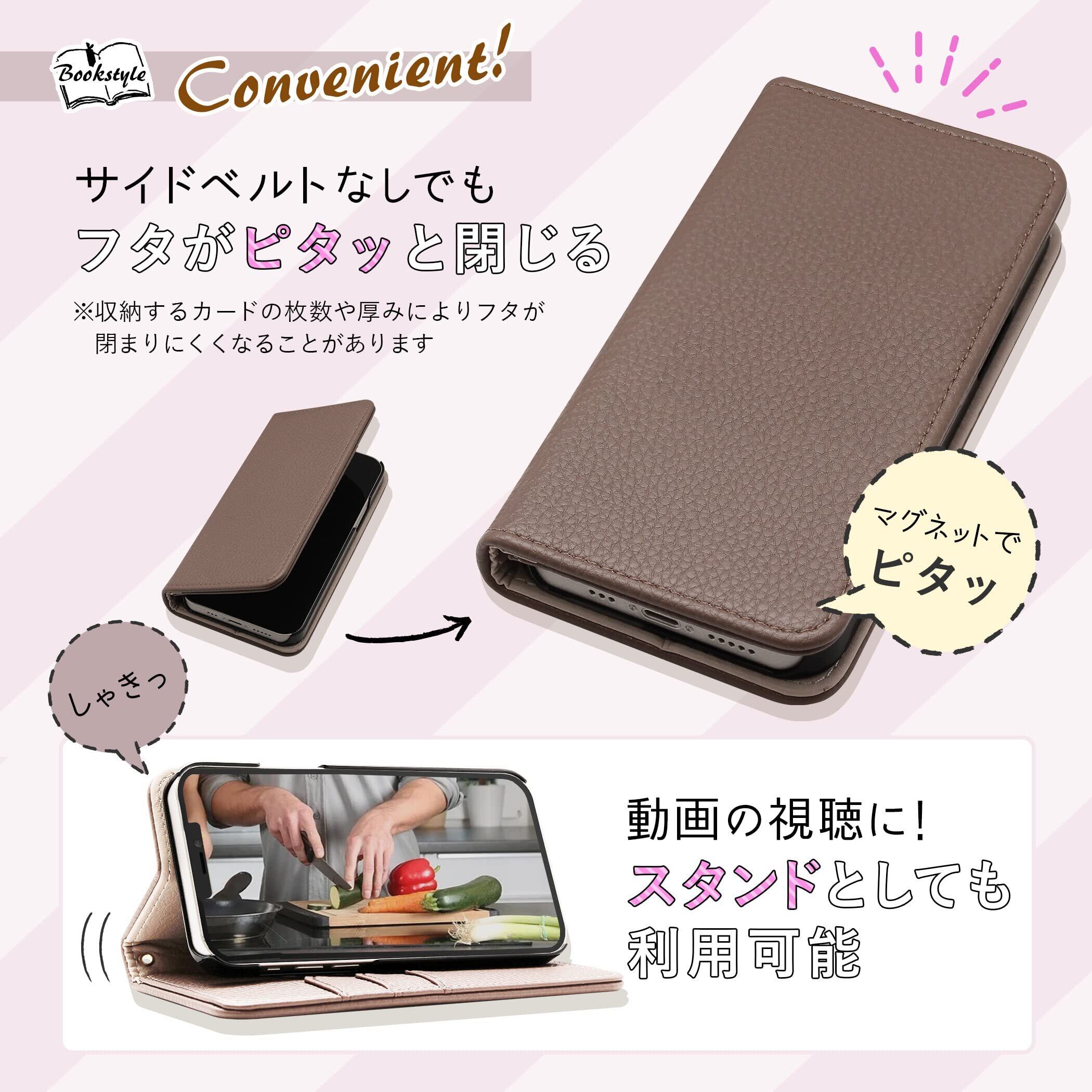 ベルトなしでもピタッと閉まるブックスタイルケース。本を開いたような可愛らしさ&スマホ全体を保護できる安心感。
