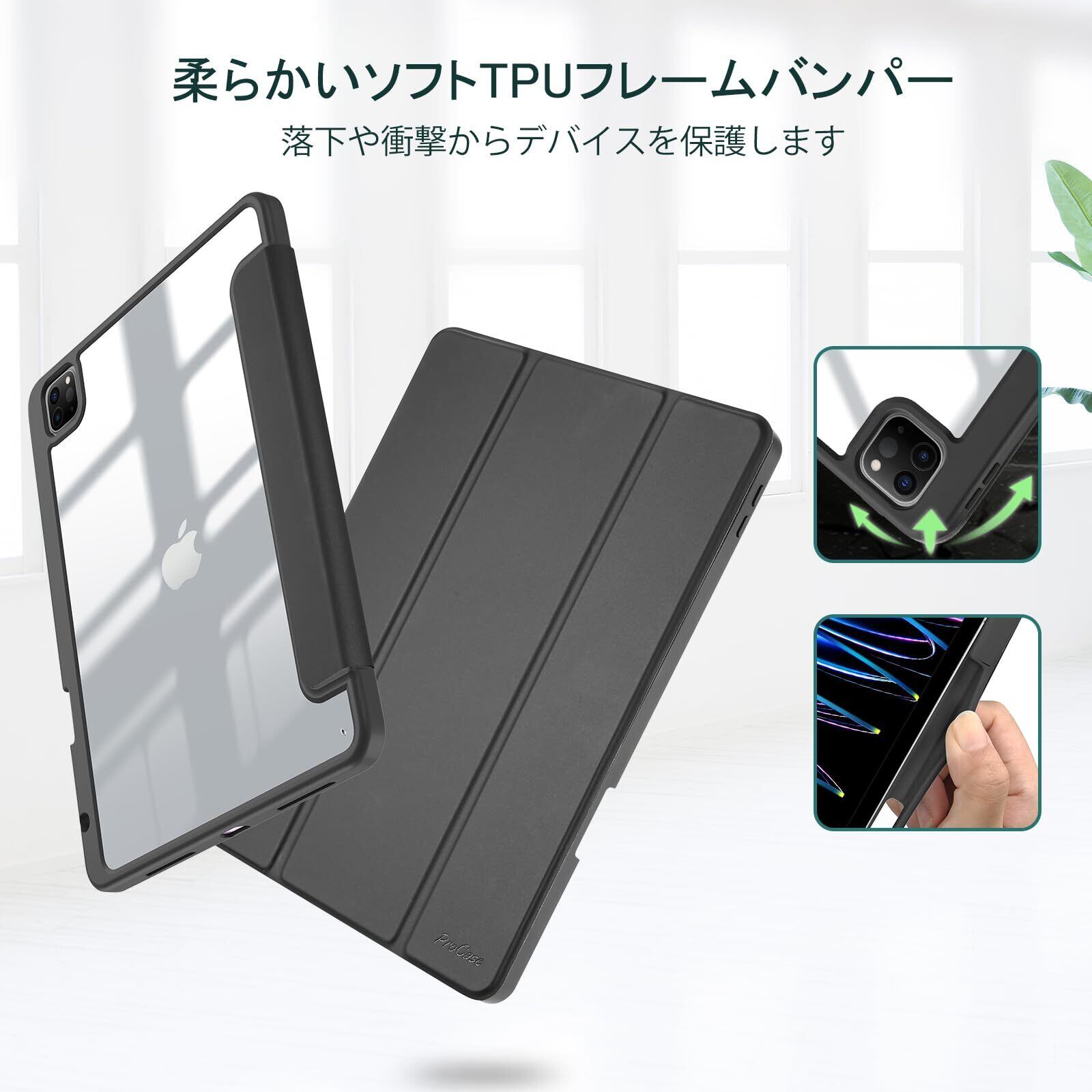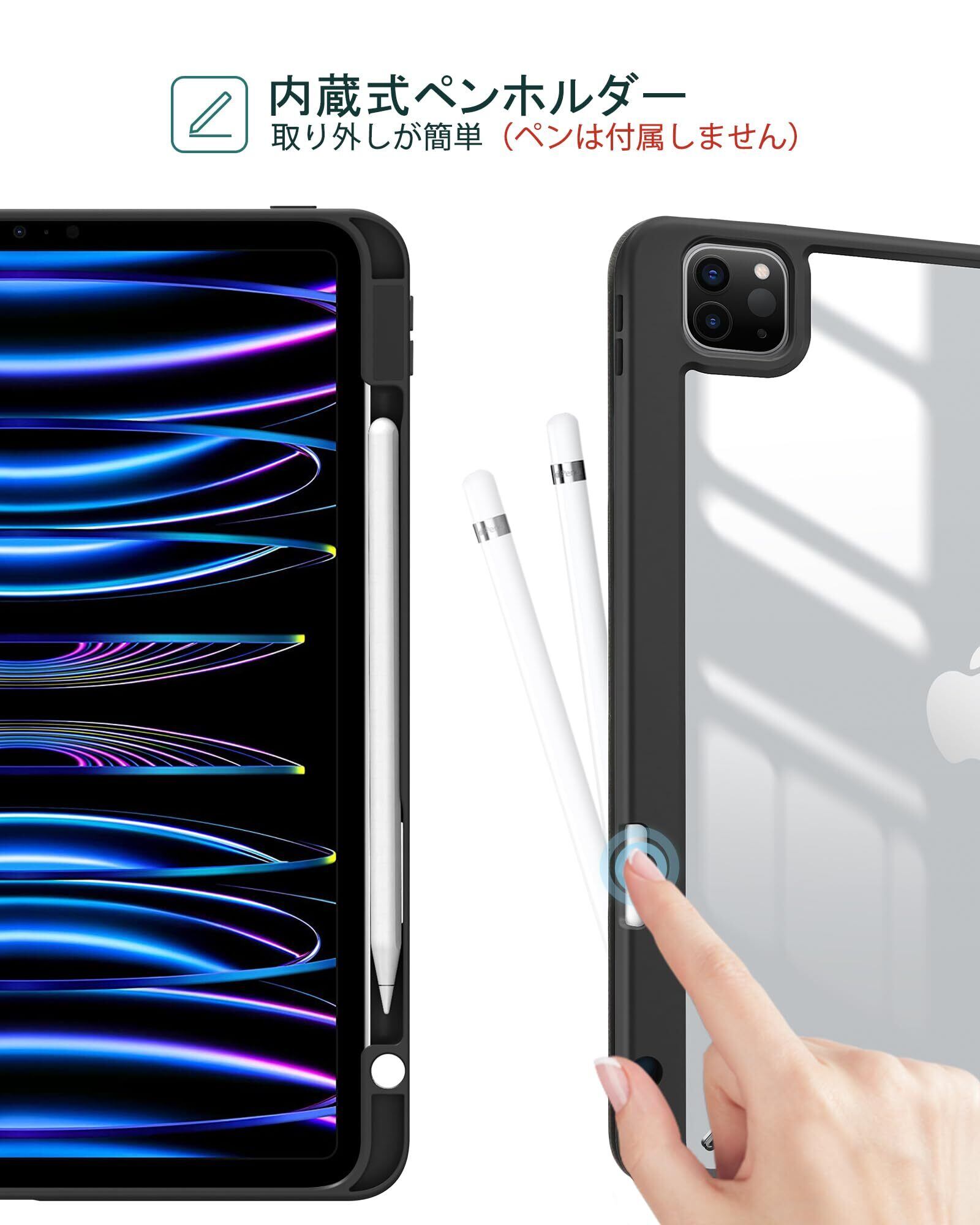 【2022最新】ProCase iPad Pro 11 ケース 第4/3/2/1世代に適用(2022 2021 2020 2018) 透明 クリアバックカバー ペン収納 耐衝撃 三つ折り スタンド スマートカバー - ブラック | gsmshop