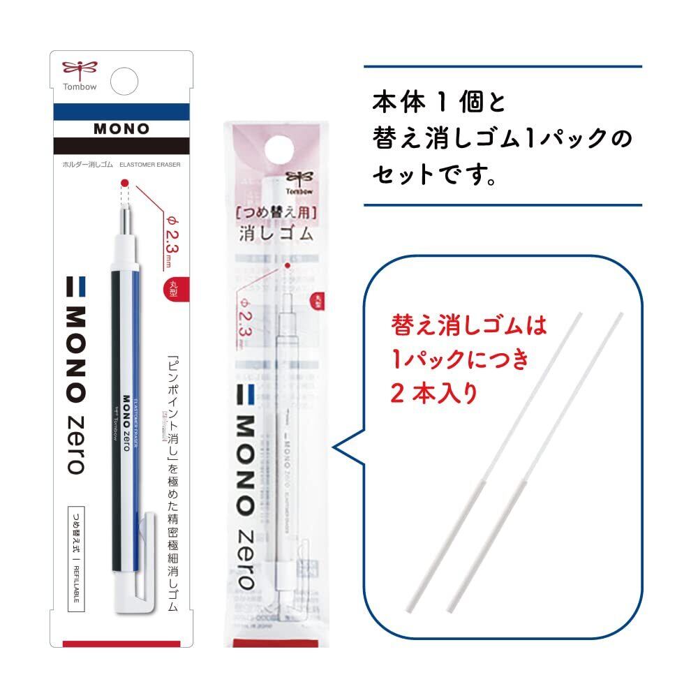 トンボ鉛筆 ペン型 消しゴム MONO モノ ゼロ 丸型 (極細2.3ミリでピンポイント消し) 本体1本+替え1パック(2本入) ノック式 ホルダー消しゴム JCB-232AZ