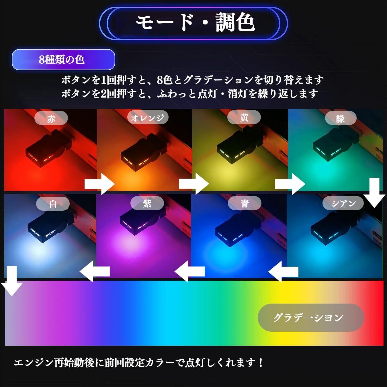 【照射方向切替・メモリー機能】usbライト180°回転可能で、必要に応じてスイングして狙った場所を照らせます。カラー記憶プログラムを搭載することにより、エンジン再始動後に前回設定カラーで点灯しくれます!面倒な再操作が不要でとても便利!