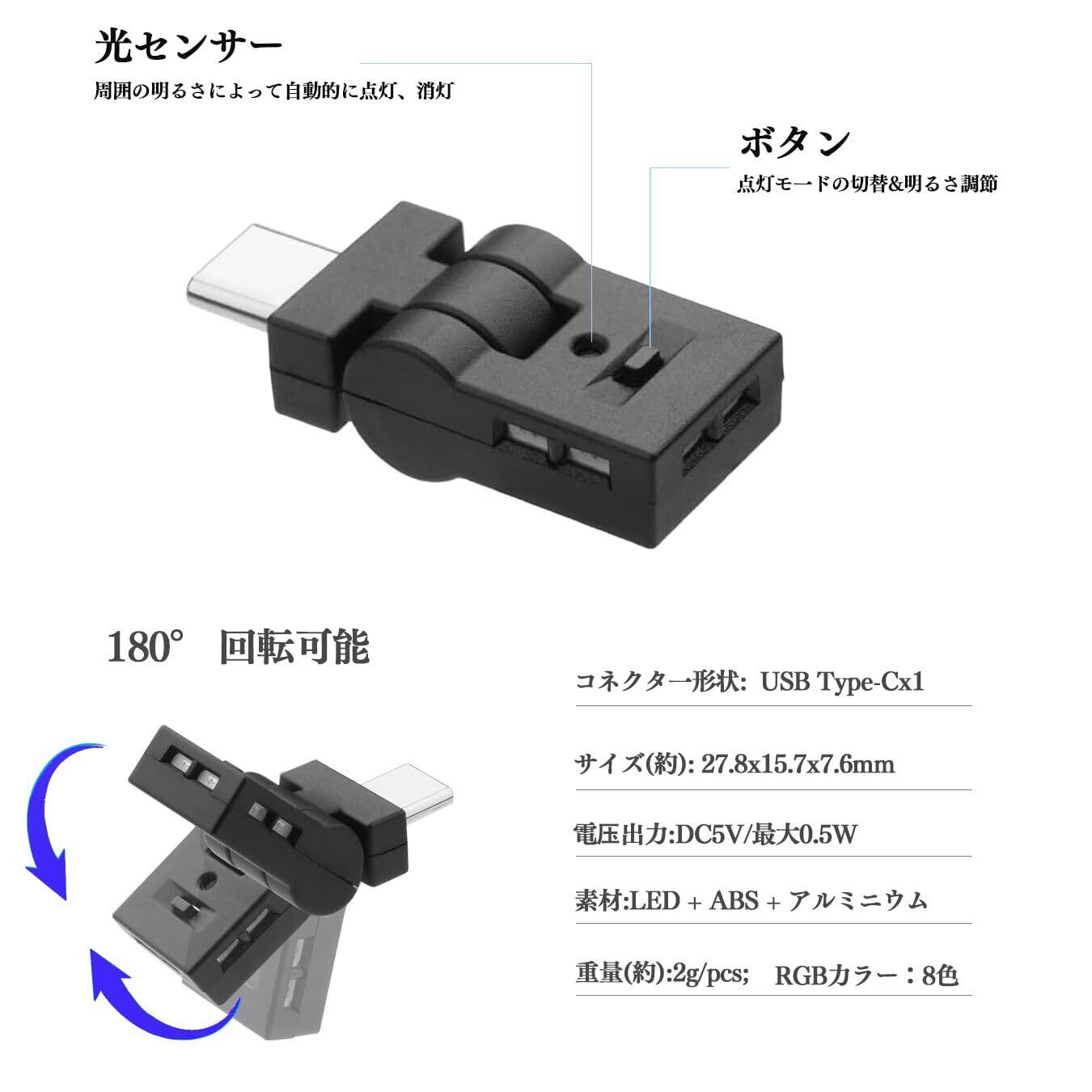 【usb ライト】車内にあるType-C USB ポートに接続するだけで、暗くなると自動に点灯するLEDライトです。車内だけでなく、USBポートがあれば、どこにでも接続して使用できます。