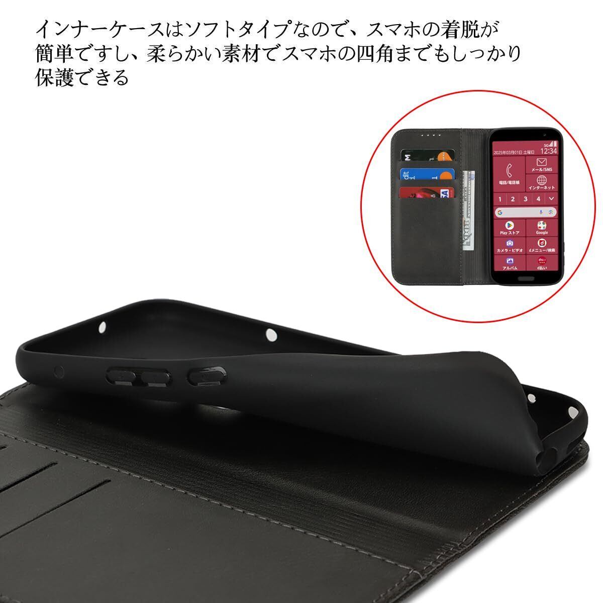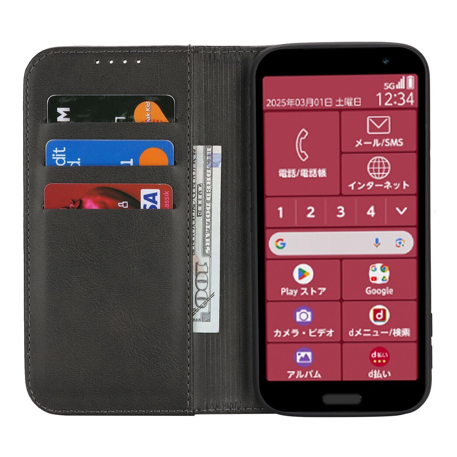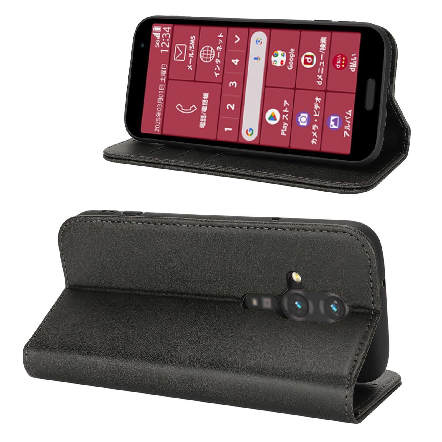 らくらくスマートフォン F-53E ケース 手帳型 docomo F53E ドコモ カードケース ラクラクスマホ ラクラクスマートフォン F-53E 手帳 携帯ケース カバー 手帳ケース 適用 case iCoverCase マグネット カードケース スマホケース カード入れ スタンド レトロ ブラック