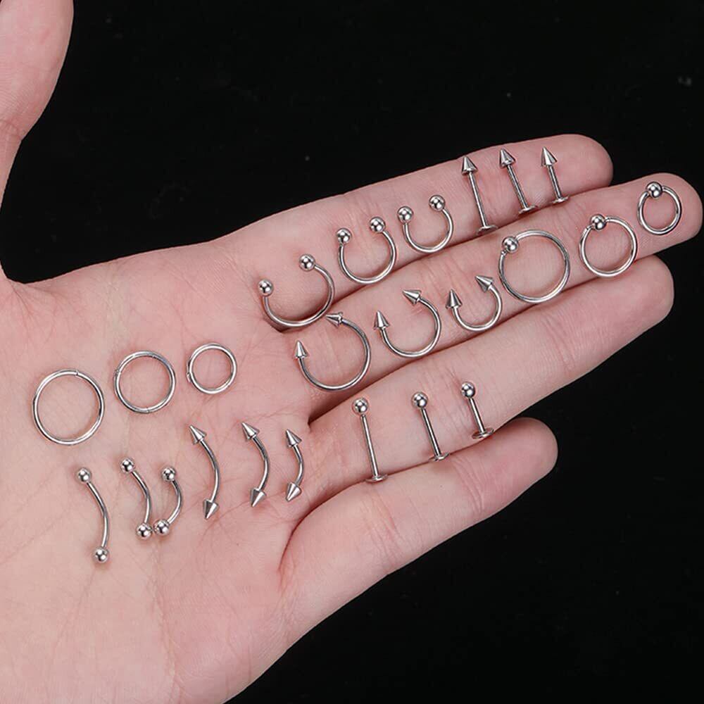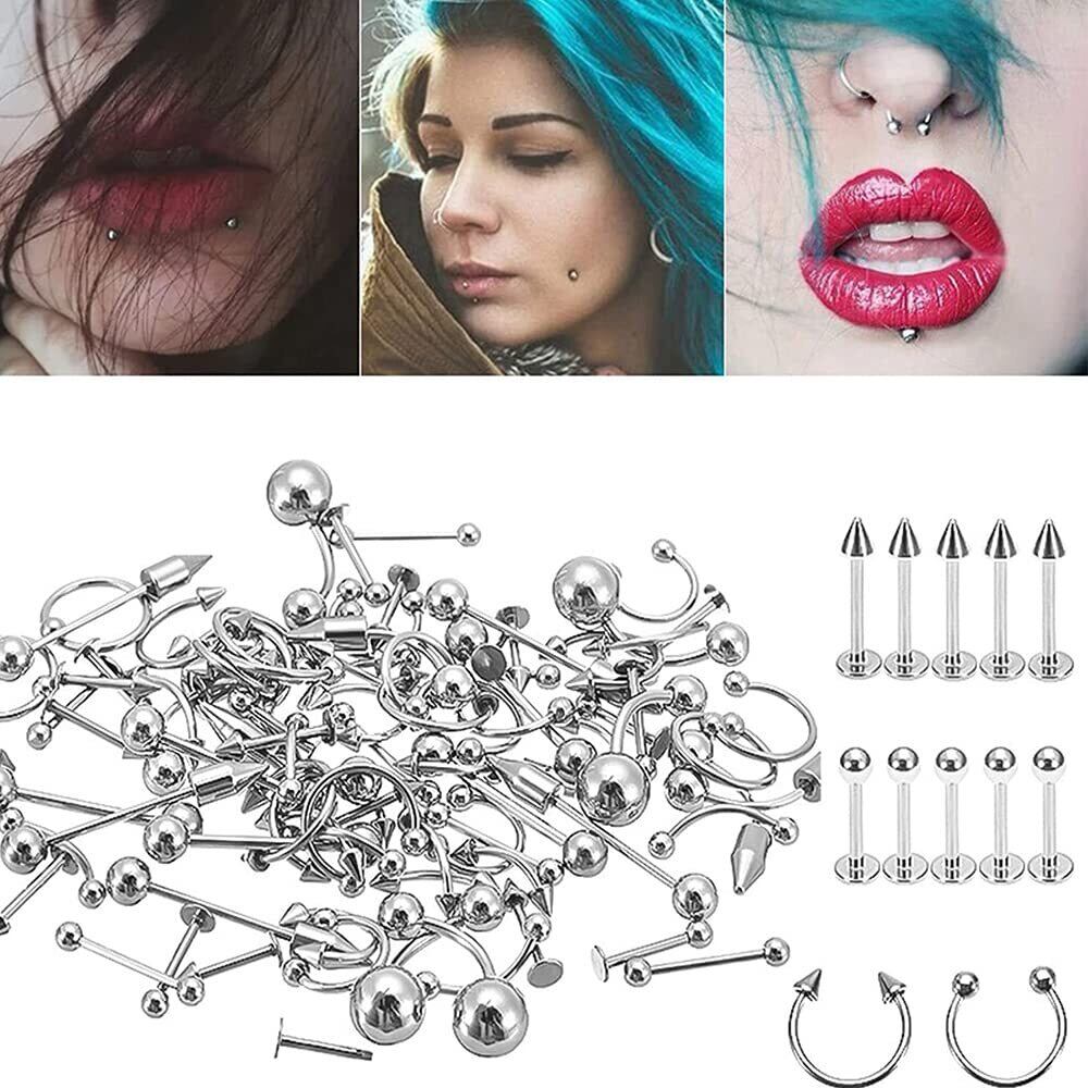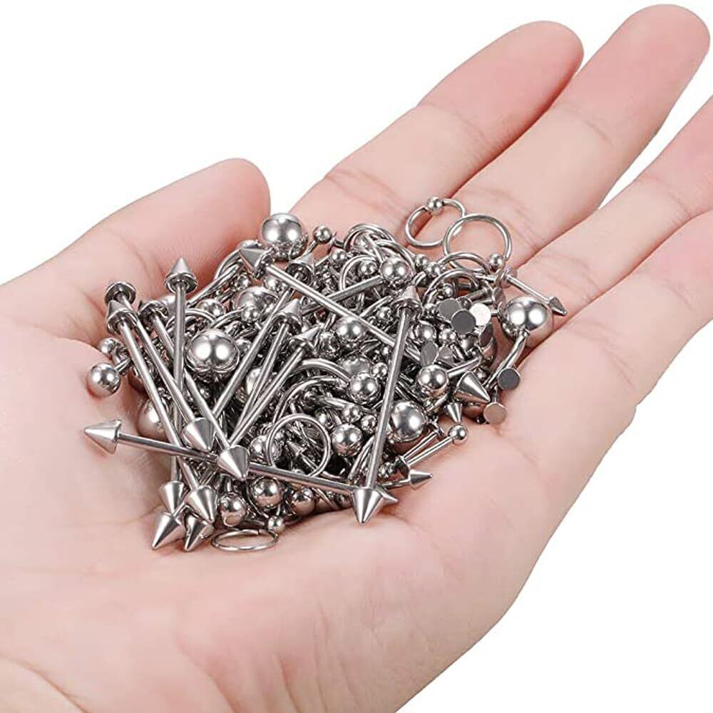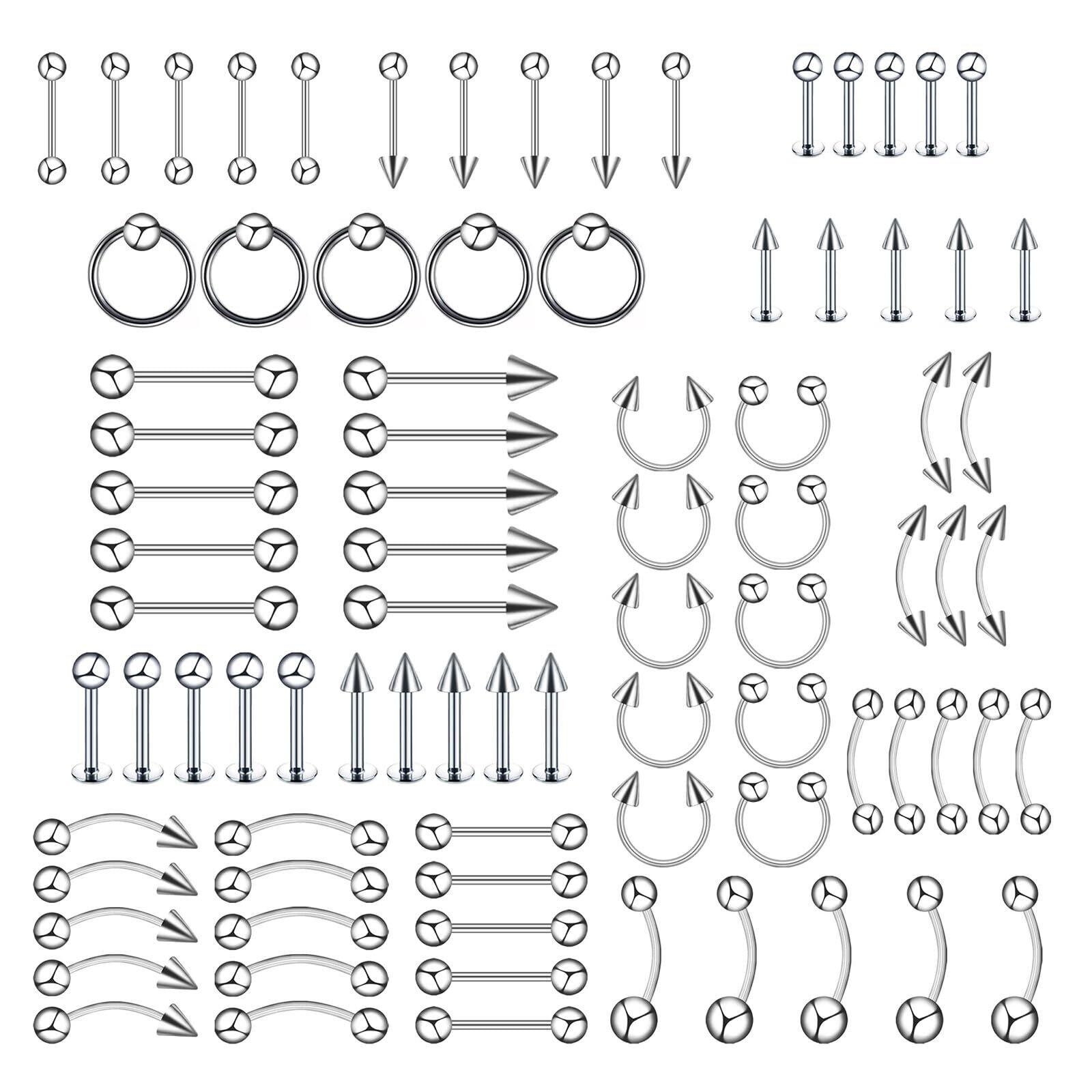 【お得な60点セット】 17種類85個ボディピアス、腹ボタンリング、ピアス、舌リング、フープノーズリング、馬蹄リング、眉毛ピアスなど。