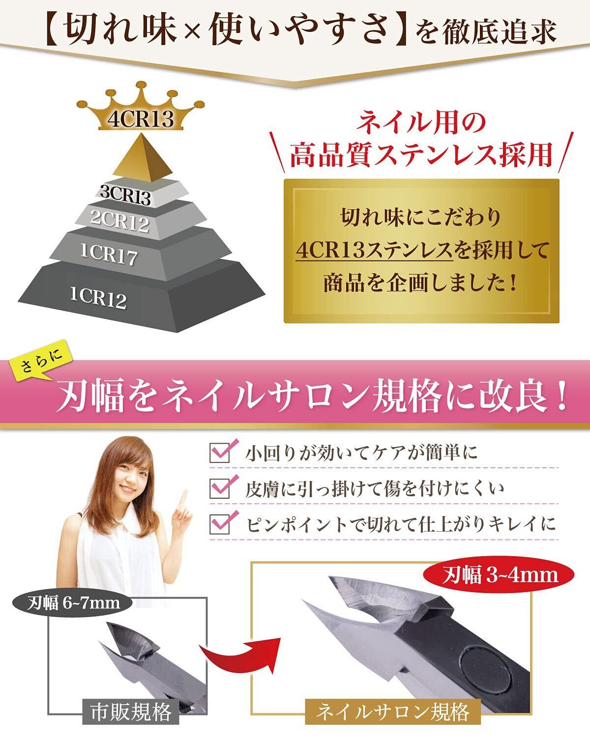 【サロン規格に改良】 ネイル用品 として流通している”キューティクルニッパー”は先端刃幅の違いという点で一般規格(6.5mm前後)とサロン規格(3.5mm前後)の2種類があります。甘皮処理 を進める上で、”キューティクルリムーバー”と”プッシャー”を使用してしっかり 甘皮 を毛羽立たせても刃幅が長い”甘皮ニッパー”だと余計な部分まで傷をつけてしまいます。”あまかわ”の処理残しは、ジェルネイルのリフトに繋がったりするため細かくケアしましょう。