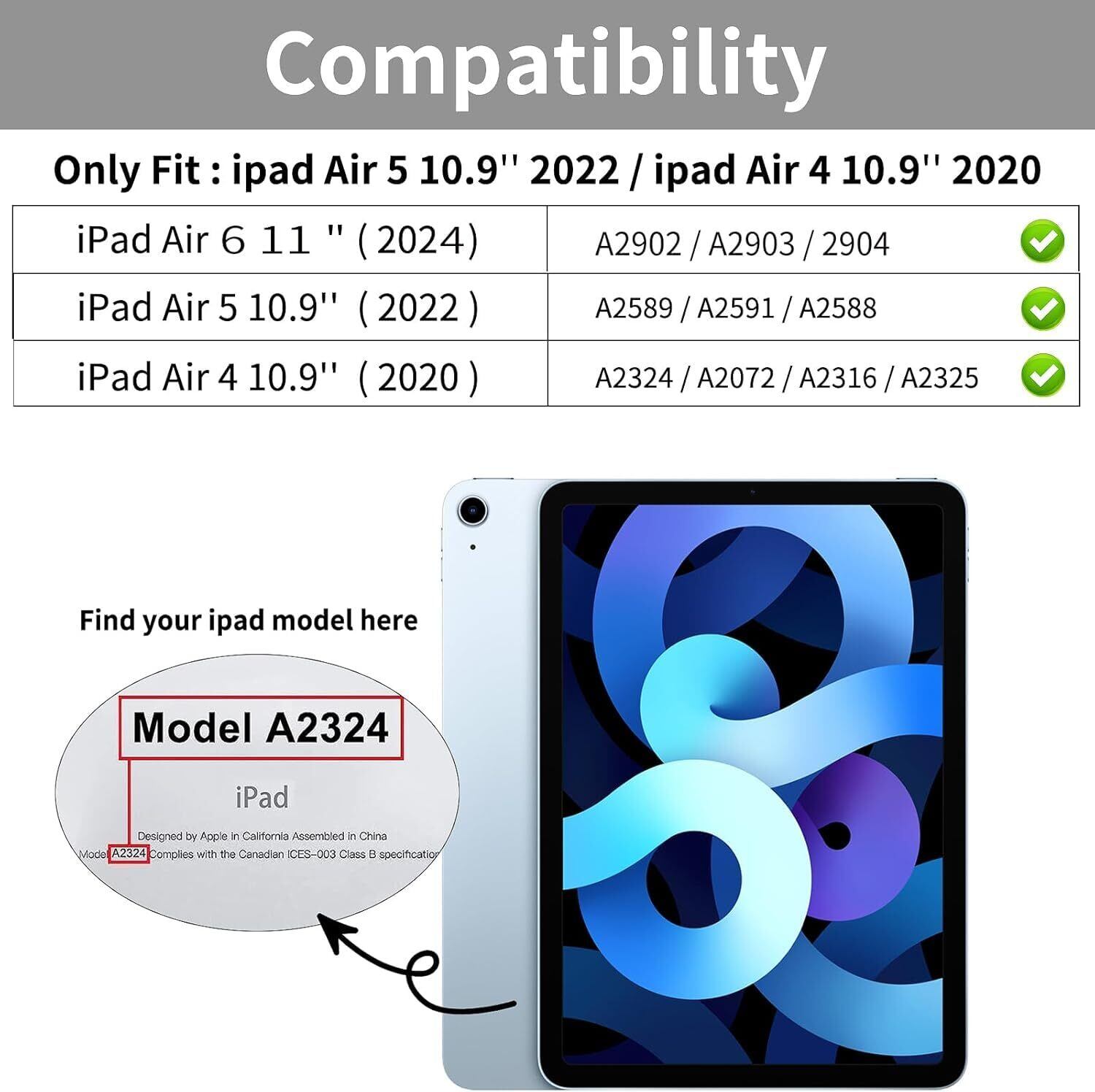 【対応機種】 iPad Air 11インチ M3 2025(A3267 A3270), iPad Air 11インチ(M2) 2024発売(モデル番号:A2902/A2903/A2904), iPad Air 第5世代2022年発売の(モデル番号:A2591、A2589、A2588)及び2020年発売のiPad Air 第4世代(モデル番号:A2316、A2324、A2325、A2072)11/10.9インチタブレットにカスタム設計しており購入する前にタブレットの機種/モデル番号を確認してください。