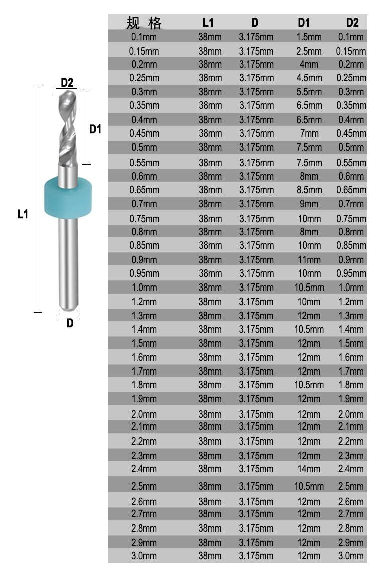 このPCBドリルビットセットは、様々な直径のドリルビットが含まれており、具体的には2.1mm/2.2mm/2.3mm/2.4mm/2.5mm/2.6mm/2.7mm/2.8mm/2.9mm/3.0mmまでの10個のビットが揃っています。シャンク径は3.175mmで、全長は38mmです。