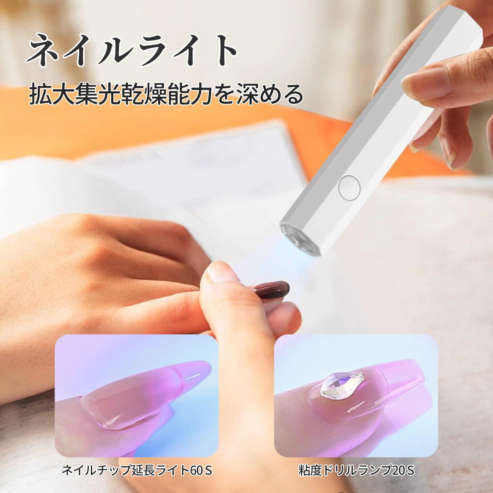 【2段階タイマー】 2つのタイマー設定モード(20秒/60秒)と最大3ワットの出力を備えています。ネイルグルーの硬化に最適で、20秒の硬化でズレずに固定され、60秒の硬化で完全に乾燥します。最初に押すと20秒タイマー設定が、2回目に押すと電源が切れます。長押しは60秒タイマー設定で、一度押すと電源が切れます。