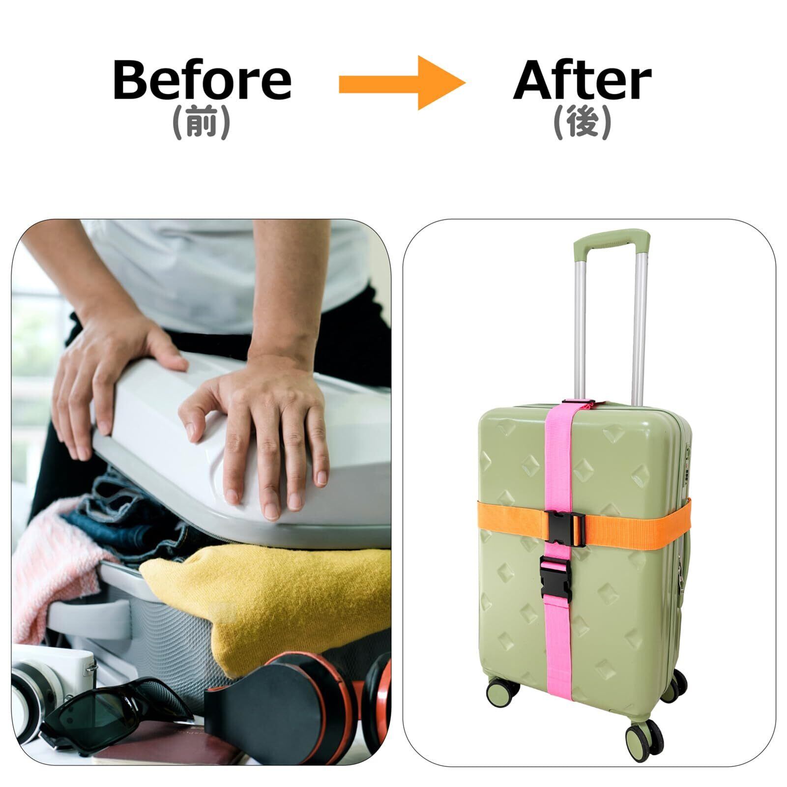 【適用】- 出張、旅行中荷崩れ防止のスーツケースベルトとして、または荷役作業、倉庫等の棚の荷崩れ防止や、資材の結束用、カーラック、キャリアーの荷物を固定する補助ベルトとして様々なシーンで大活躍します