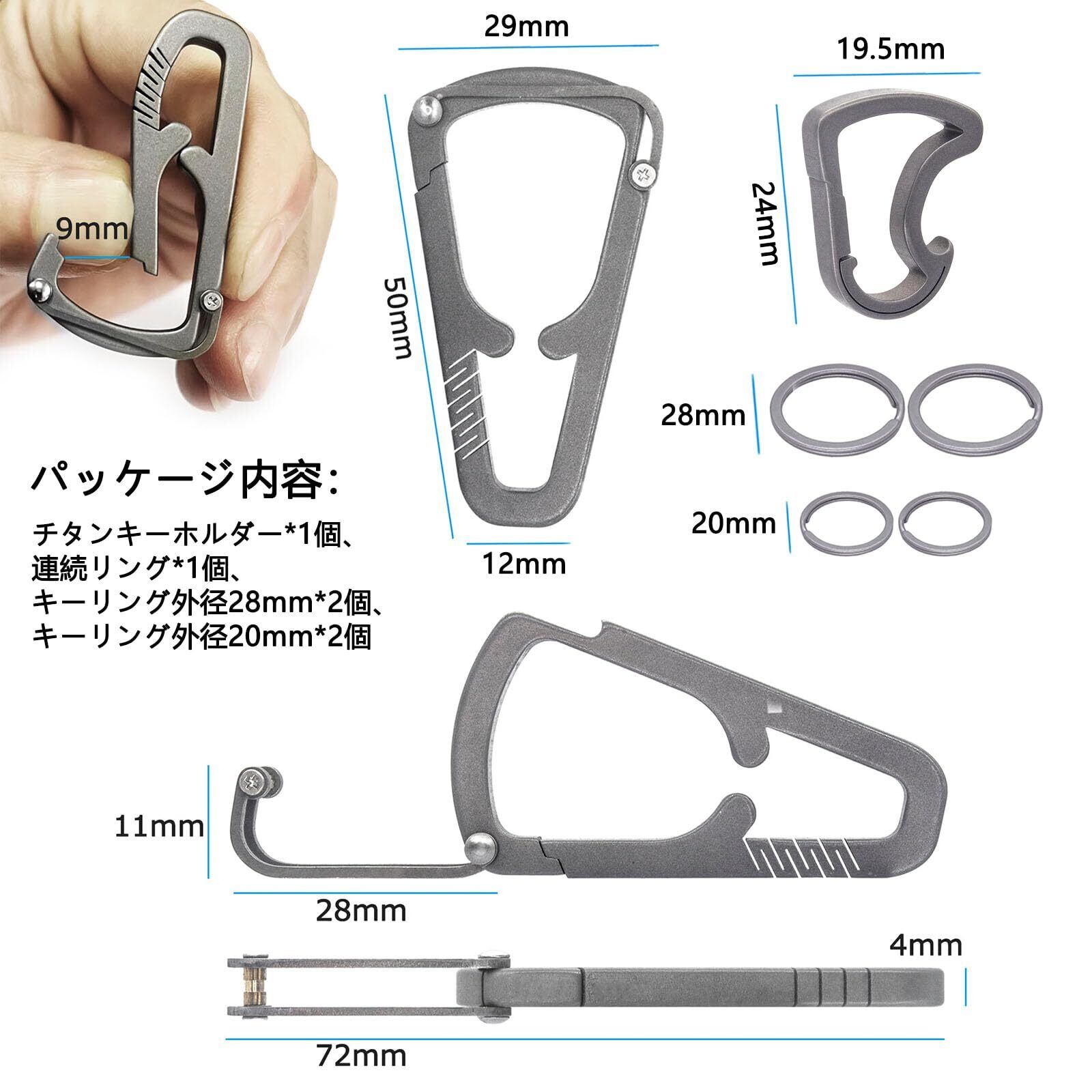 【基本情報】チタンキーホルダー(携帯電話ホルダー機能付きで、どの携帯電話機種にも対応。)、カラー:グレー、材質:チタン合金(TC4)、サイズ:29*50*4mm、重さ:約9g、パッケージ内容:チタンキーホルダー*1個、連続リング*1個、キーリング外径28mm*2個、キーリング外径20mm*2個。美しく設計され、軽量で耐久性に優れ、錆びにくく、耐腐食性があり、変色しにくく、摩耗に強く、省スペースで持ち運びが便利です。(注:本製品は登山には適しておらず、過度の負荷がかかる場面には適さない。)