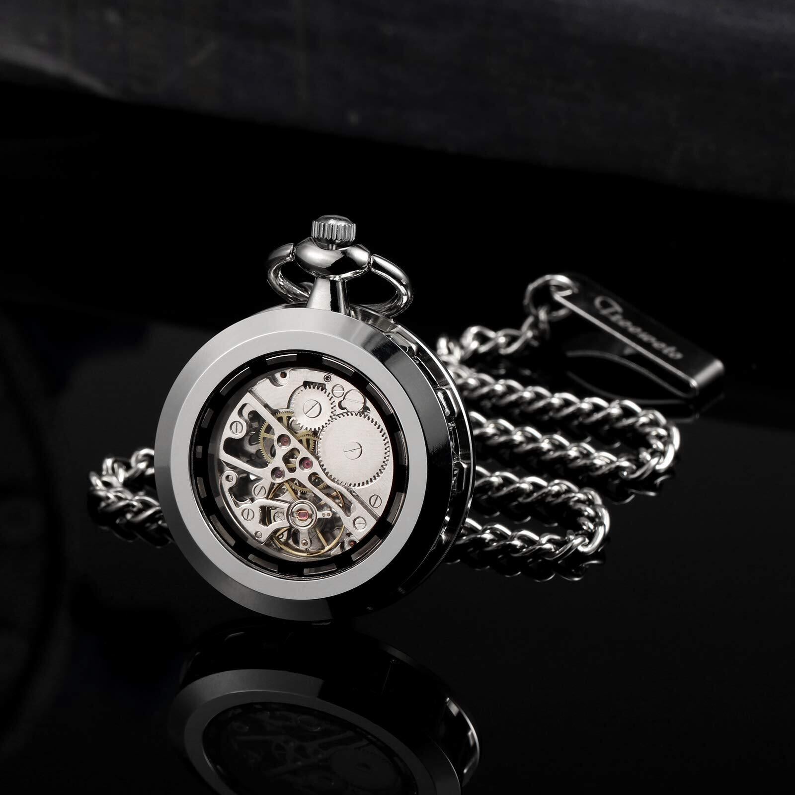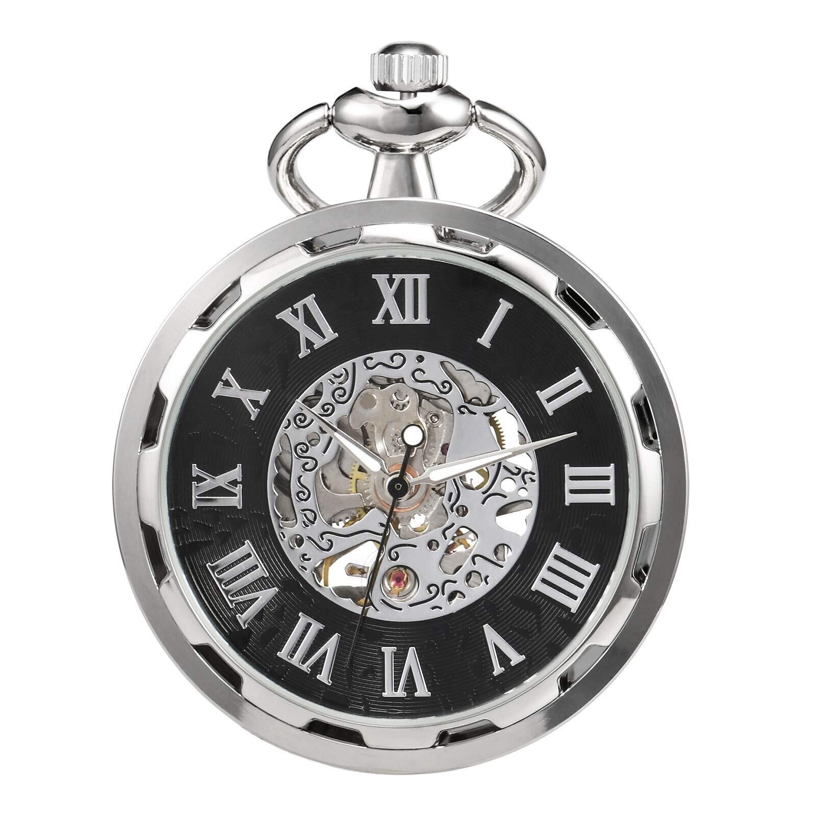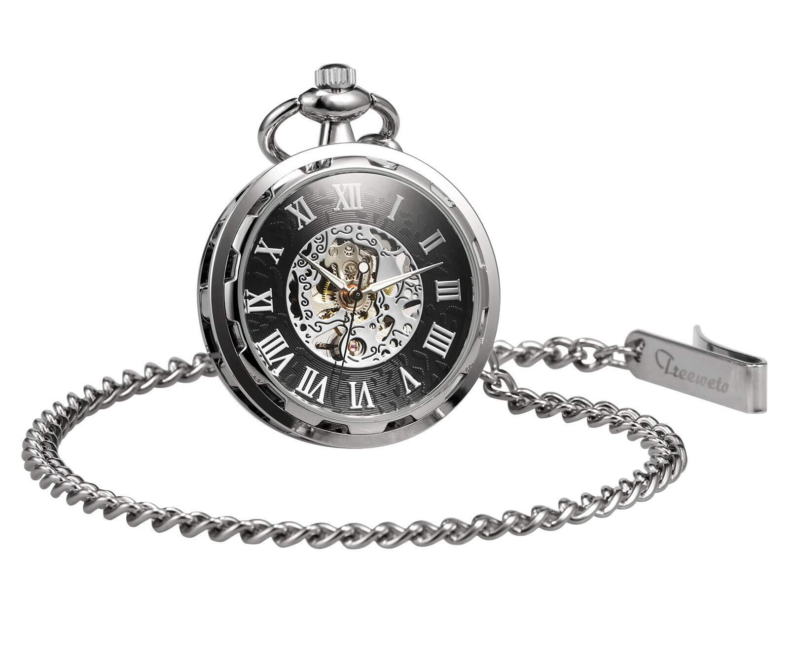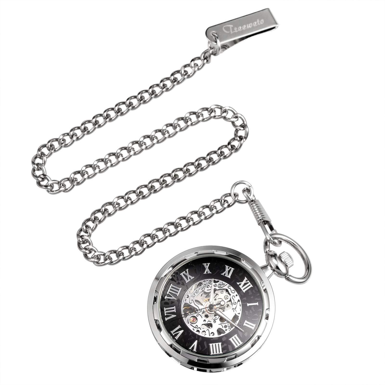 TREEWETO 懐中時計 手巻き アンティーク 機械式 スケルトン メンズ チェーン付き (シルバー)