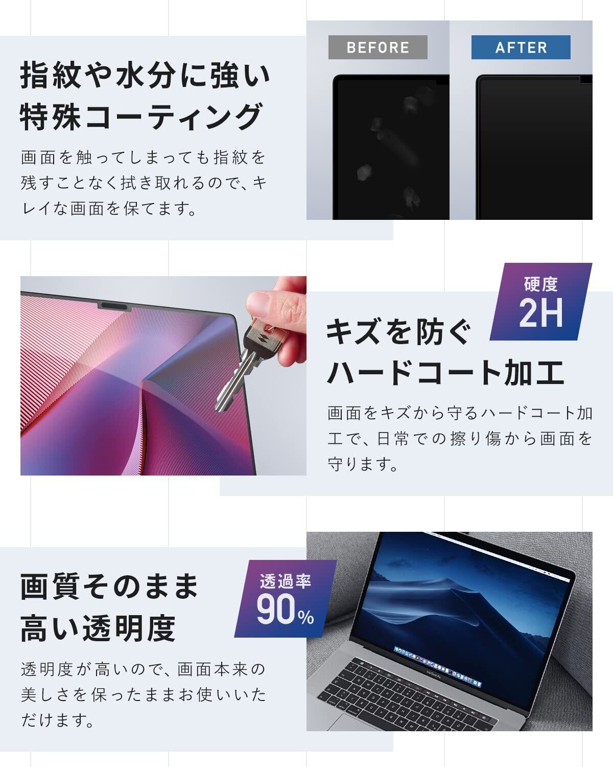 画質そのまま高い透明度:透明度が高いので、画面本来の美しさを保ったままお使いいただけます。