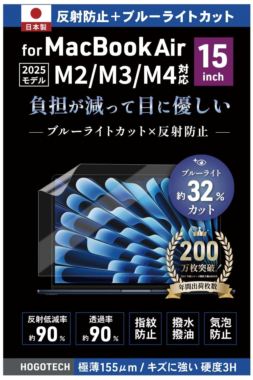 2025年 M4モデル対応【日本製】ブルーライトカット アンチグレア MacBook Air 15インチ 保護フィルム 2024 2023 A3114 A2941 反射防止 気泡防止 HOGOTECH