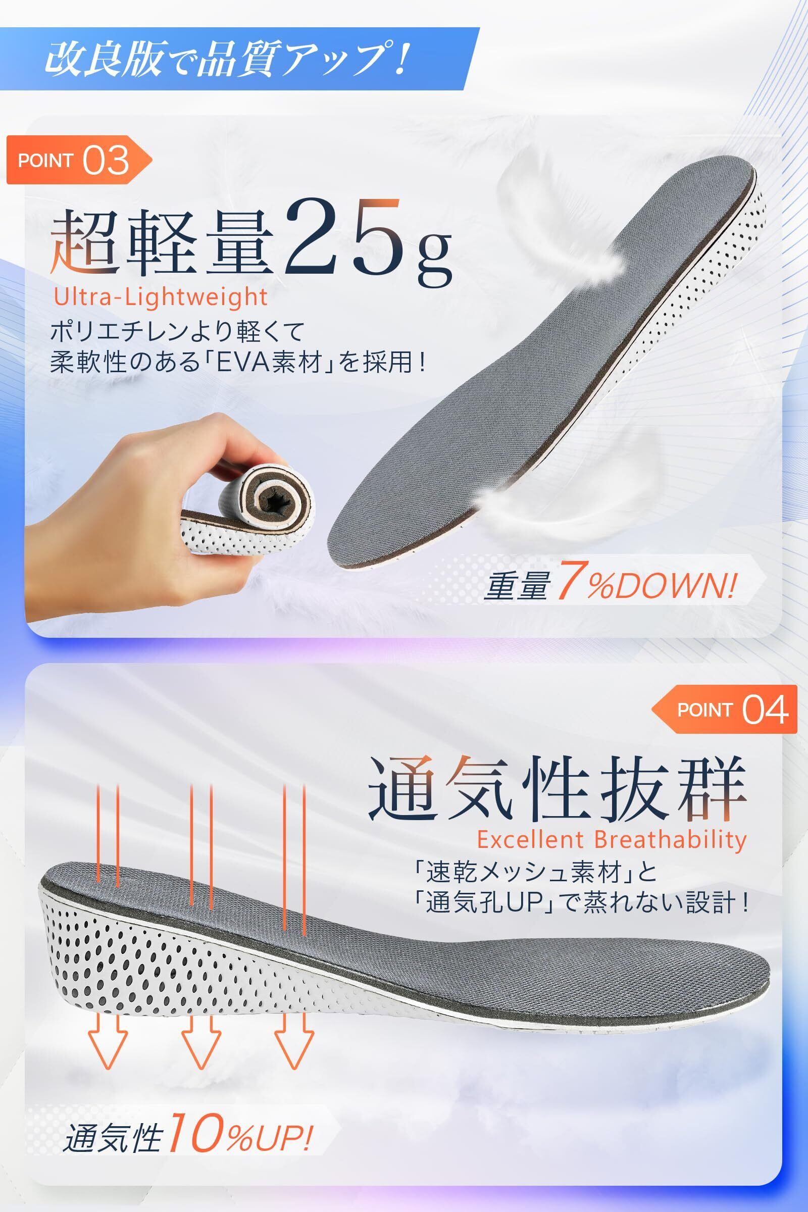 【高弾性&軽量&高強度EVA】どんな靴にもフィットする高弾性だから、お手持ちの靴で即身長アップ!片足約30gの超軽量かつ高強度のEVA素材を採用。