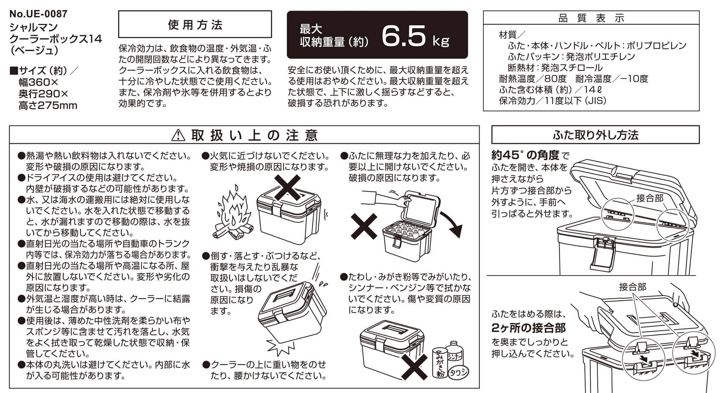 材質:ふた・本体・ハンドル・ベルト/ポリプロピレン、ふたパッキン/発泡ポリエチレン、断熱材/発泡スチロール、耐熱温度/80度、耐冷温度/-10度、原産国:日本