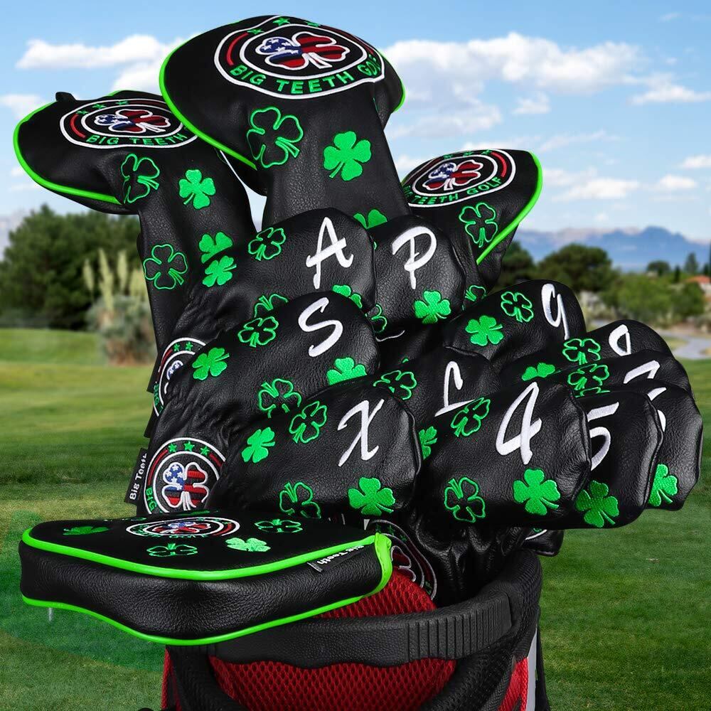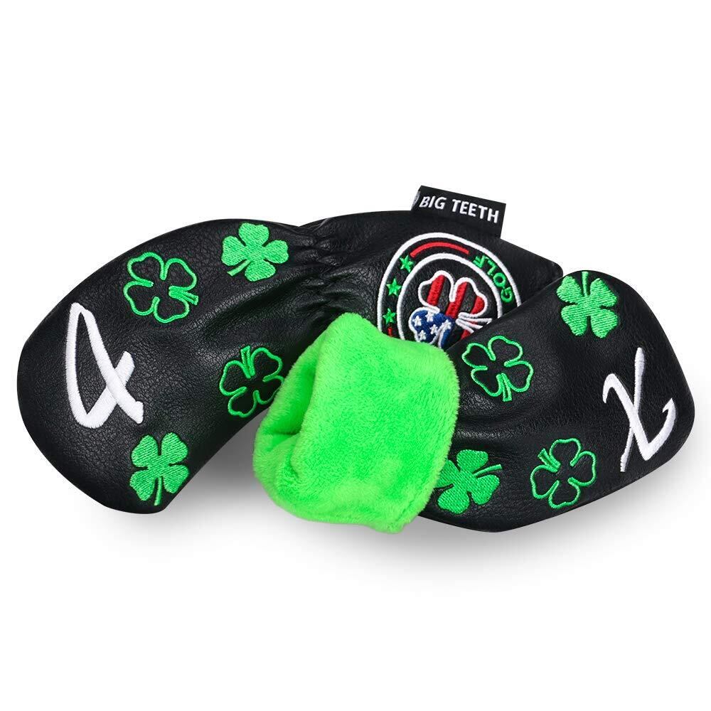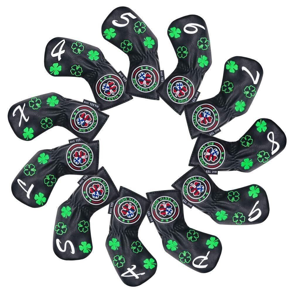 Big Teeth(ビッグティース) ゴルフアイアンカバー ヘッドカバー セット 11枚入り(4〜9、P、A、S、L、X)番号刺繍 ロングネック エラスティック開閉 クローバー刺繍 合成レザー ブラック/ホワイト 右手用
