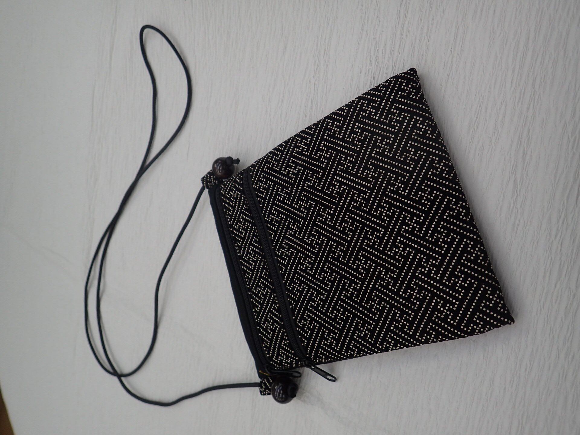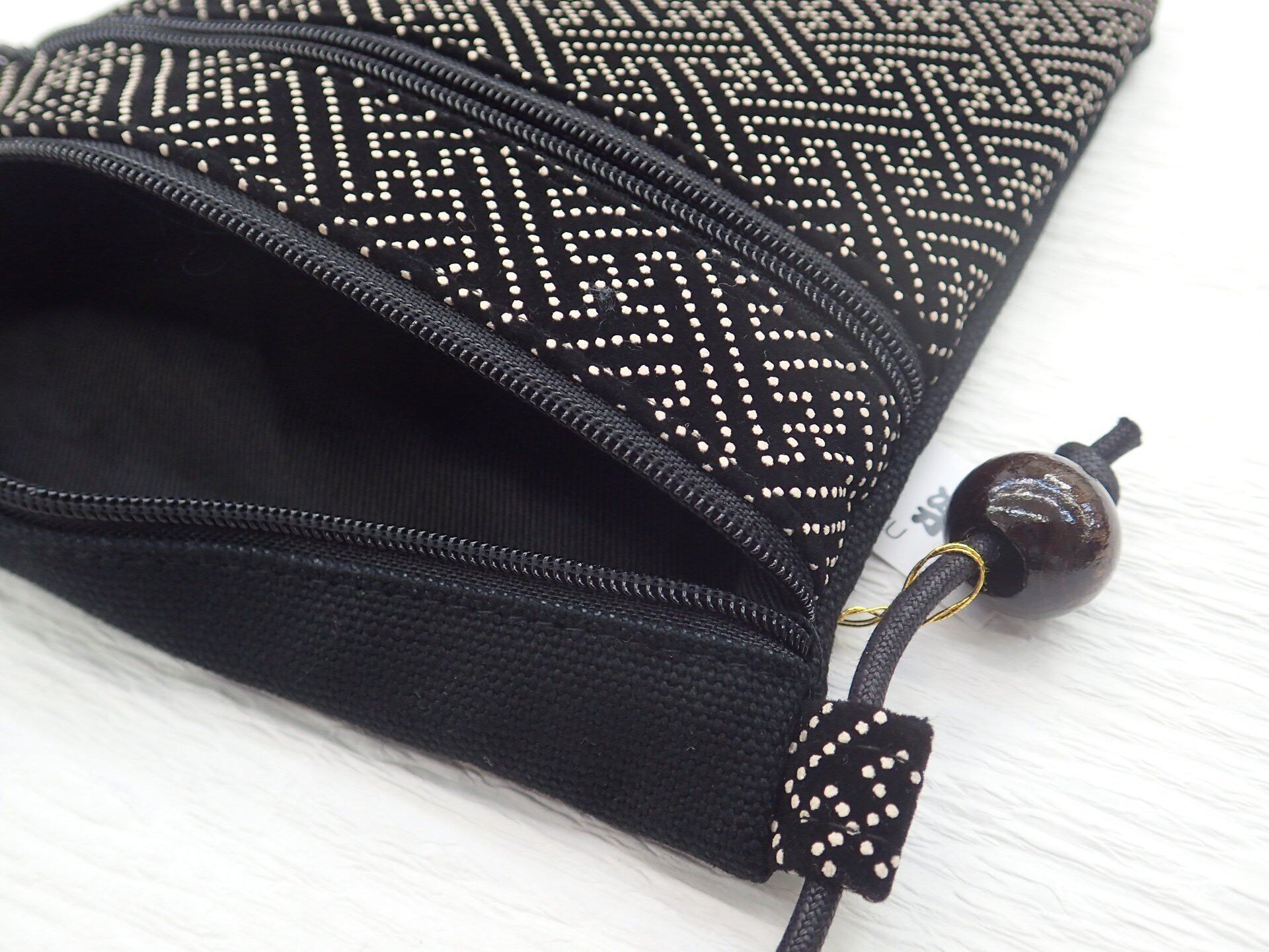 普段のお出掛けに使える和柄ポシェット。 男女兼用で使用可能です。 開口部はファスナーでポケット2つ付いています。 裏生地の色目:黒 紗彩形とは、「不断長久」を意味する吉祥文様です。別名『繋ぎ文』