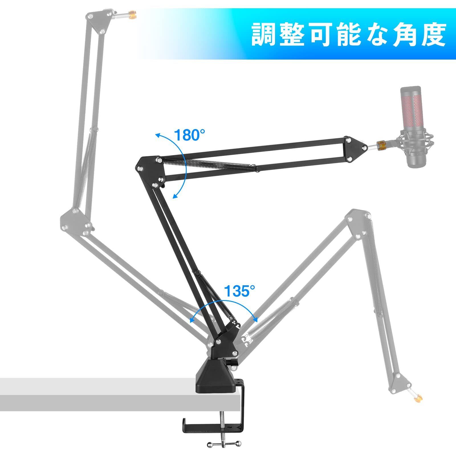 【安定性】このマイクブームアームは、各アームに高品質のデュアルサスペンションスプリングを備えており、HyperX QuadCast Sマイクを震動、沈み込みから保護し、騒音の発生を防ぐことができます。
