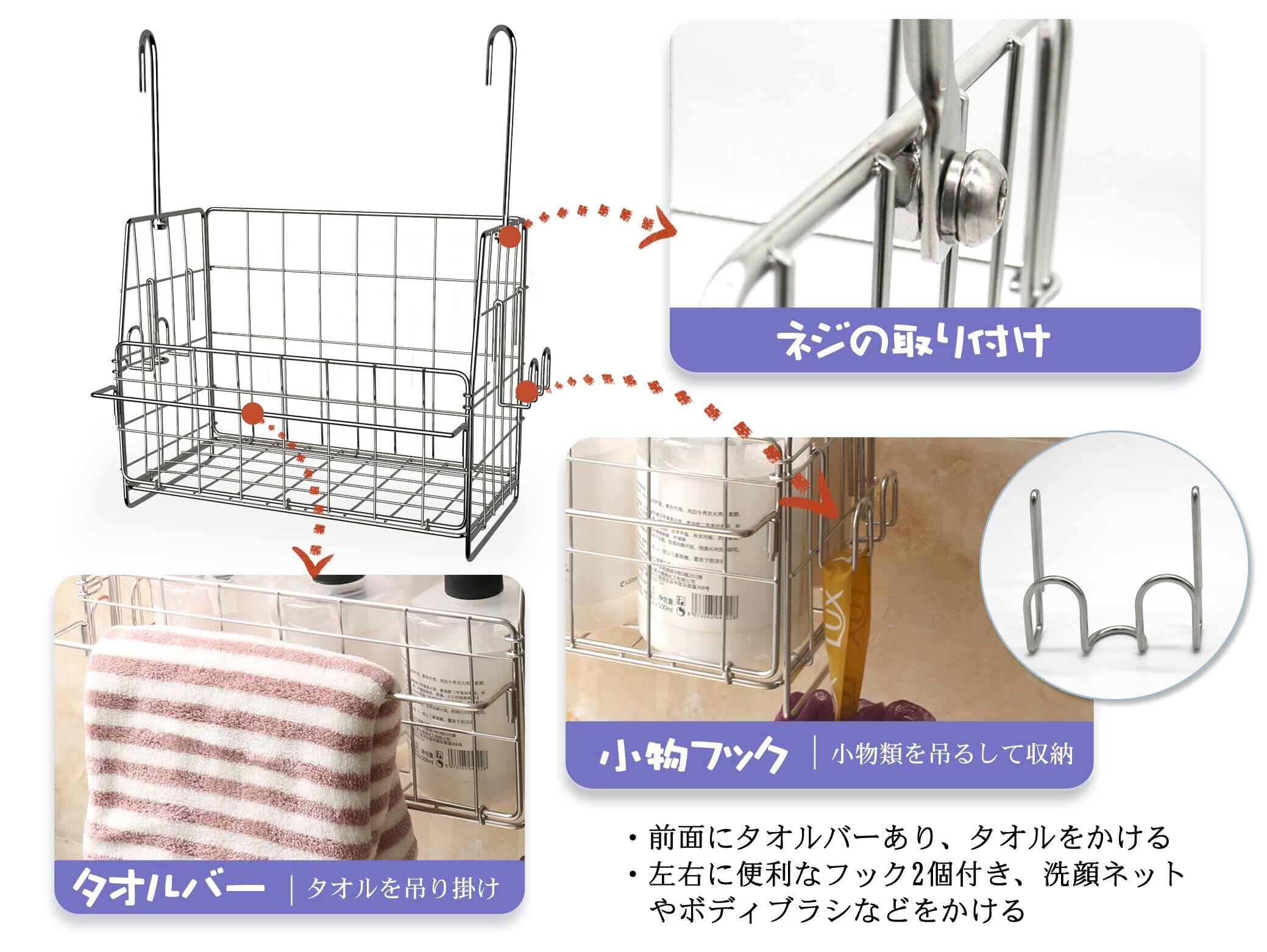 【すっきり収納】物干しやタオルバーに引っ掛けて乾かせるので衛生的です、シャンプーなどのバスグッズやお子様のお風呂用おもちゃをまとめて収納できます。浴室だけではなく、洗面所、キッチンいろんな場所で収納グッズとして活躍します、