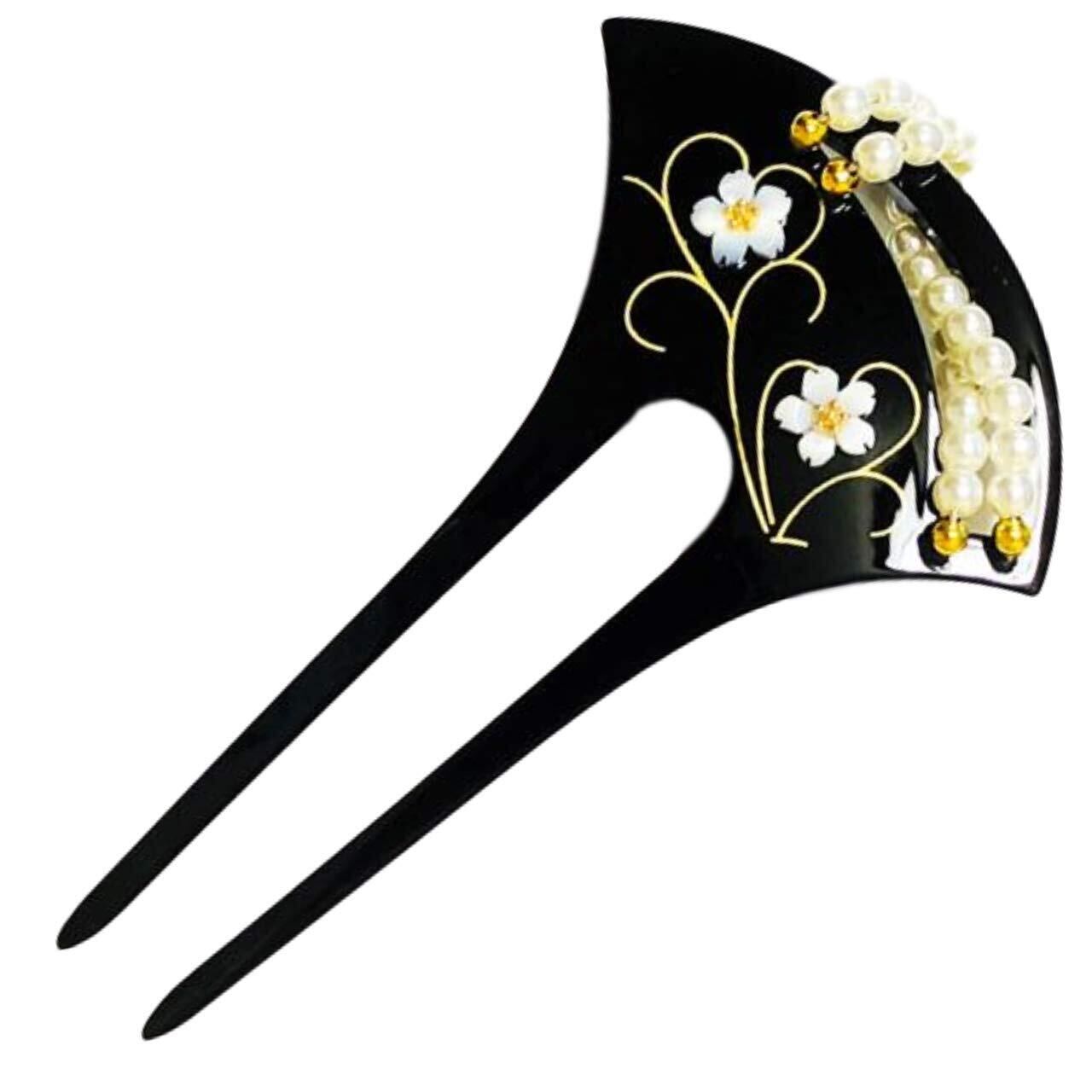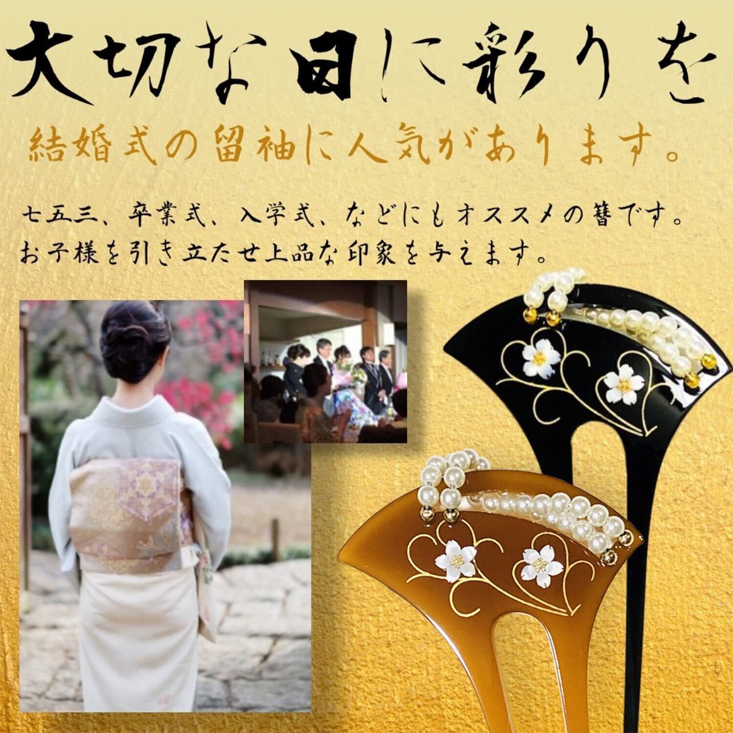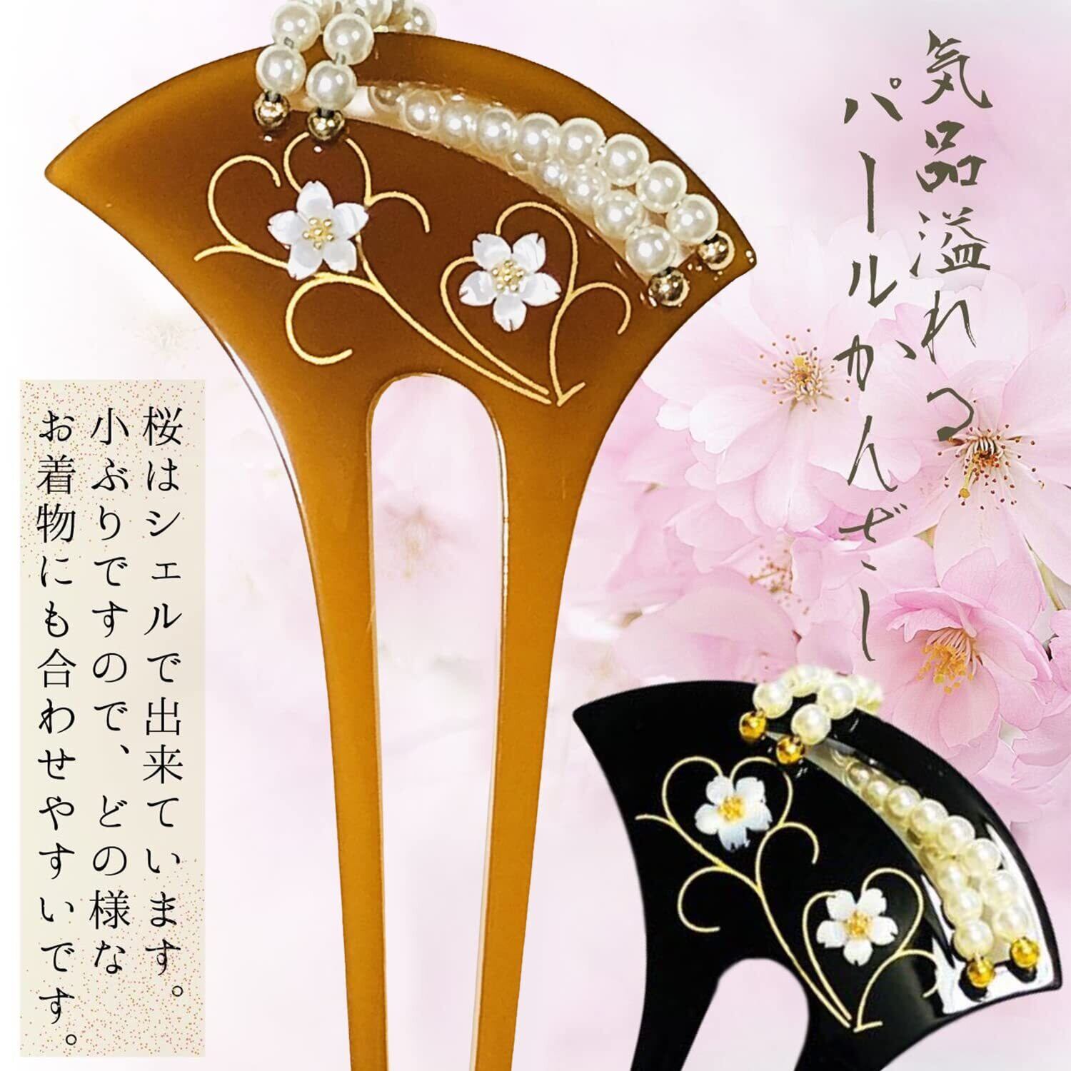 バチ型の簪(かんざし)です。パールと立体感のある桜が上品な可愛さがあります。小ぶりですが、黒にゴールドが映え、まとめ髪に彩りを添えます。 結婚式、卒業式、入学式、七五三など、節目の行事の際に。またお着物をお召しになった際に、ぜひかんざしを合わせてみてはいかがでしょう。