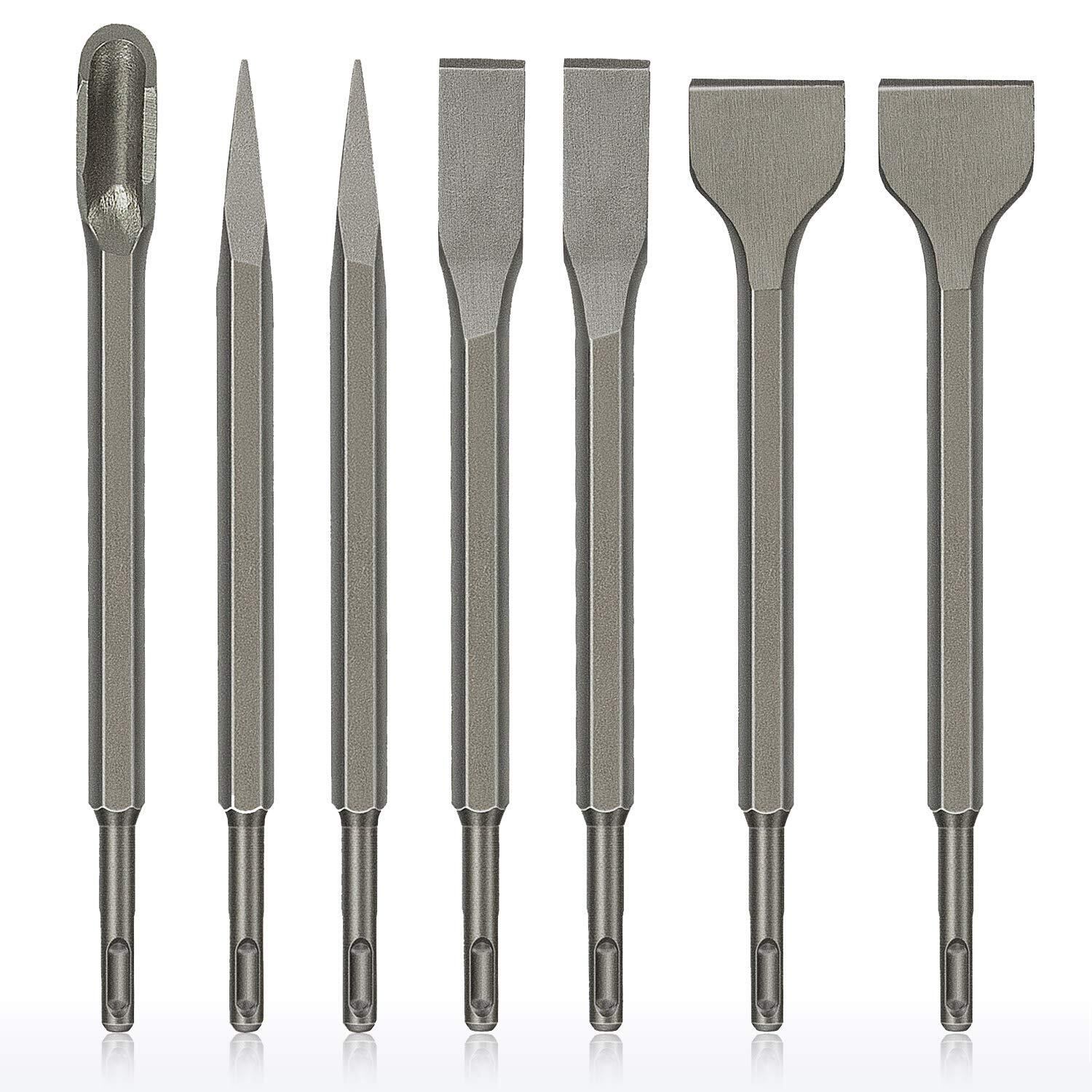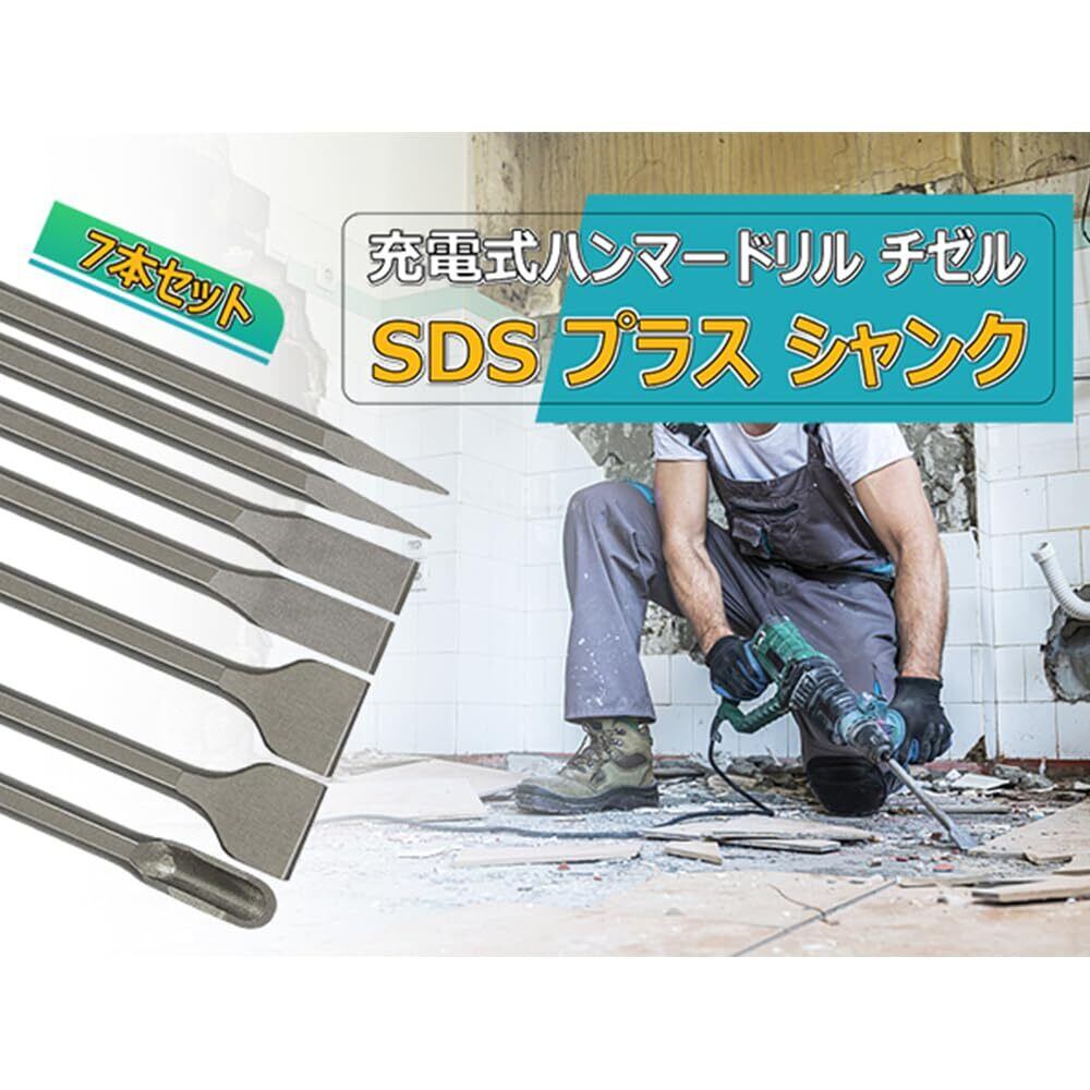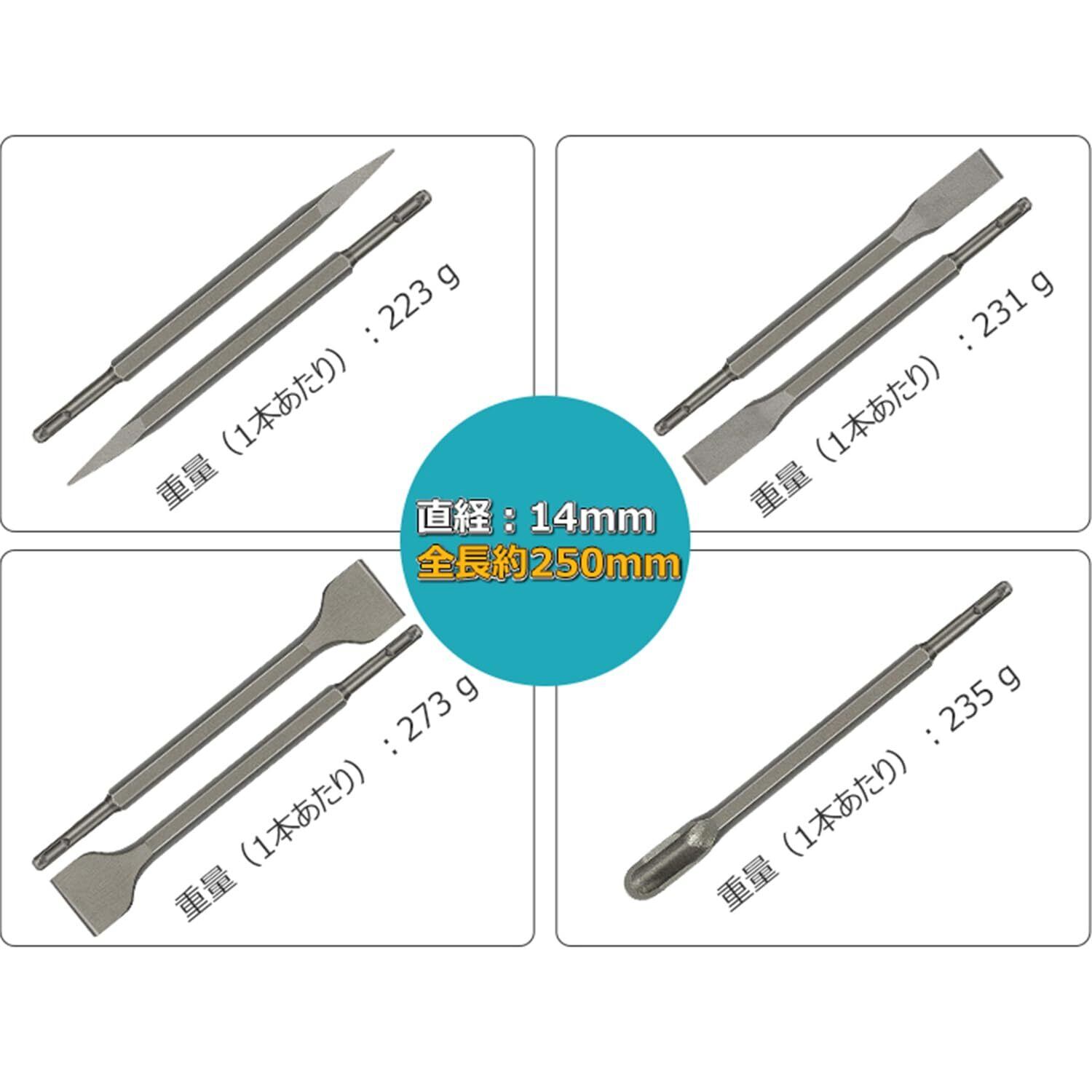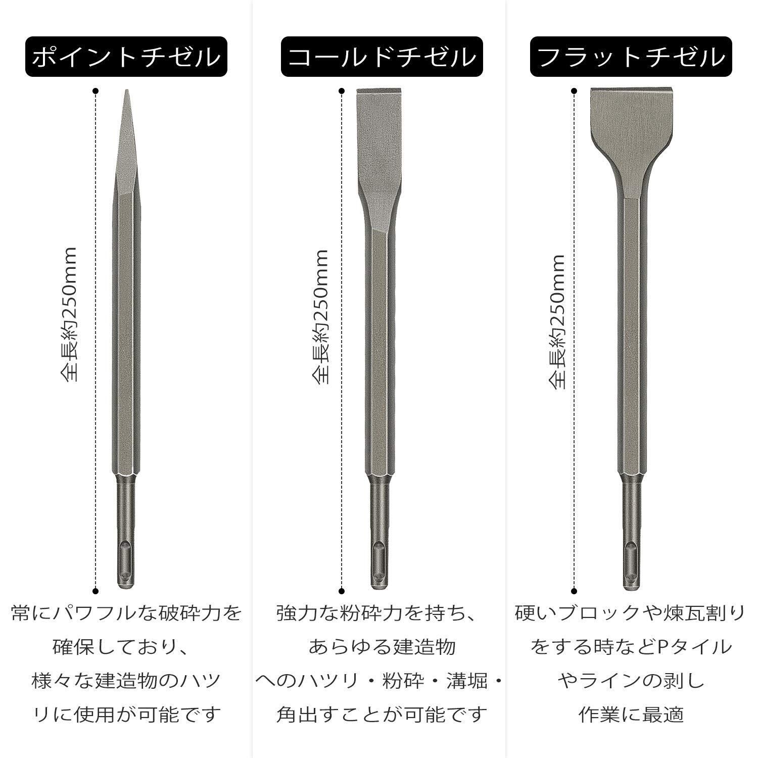 ■重量:1.73 kg ■有効長:250mm ■材質:45crタングステン鋼 ■フラットチゼル×2本 U型チゼル×1本 ポイントチゼル×2本 コールドチゼル×2本(合わせて7本)