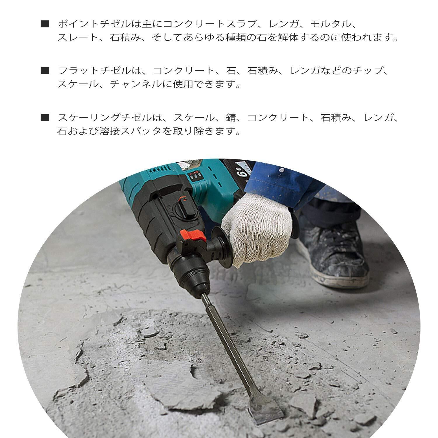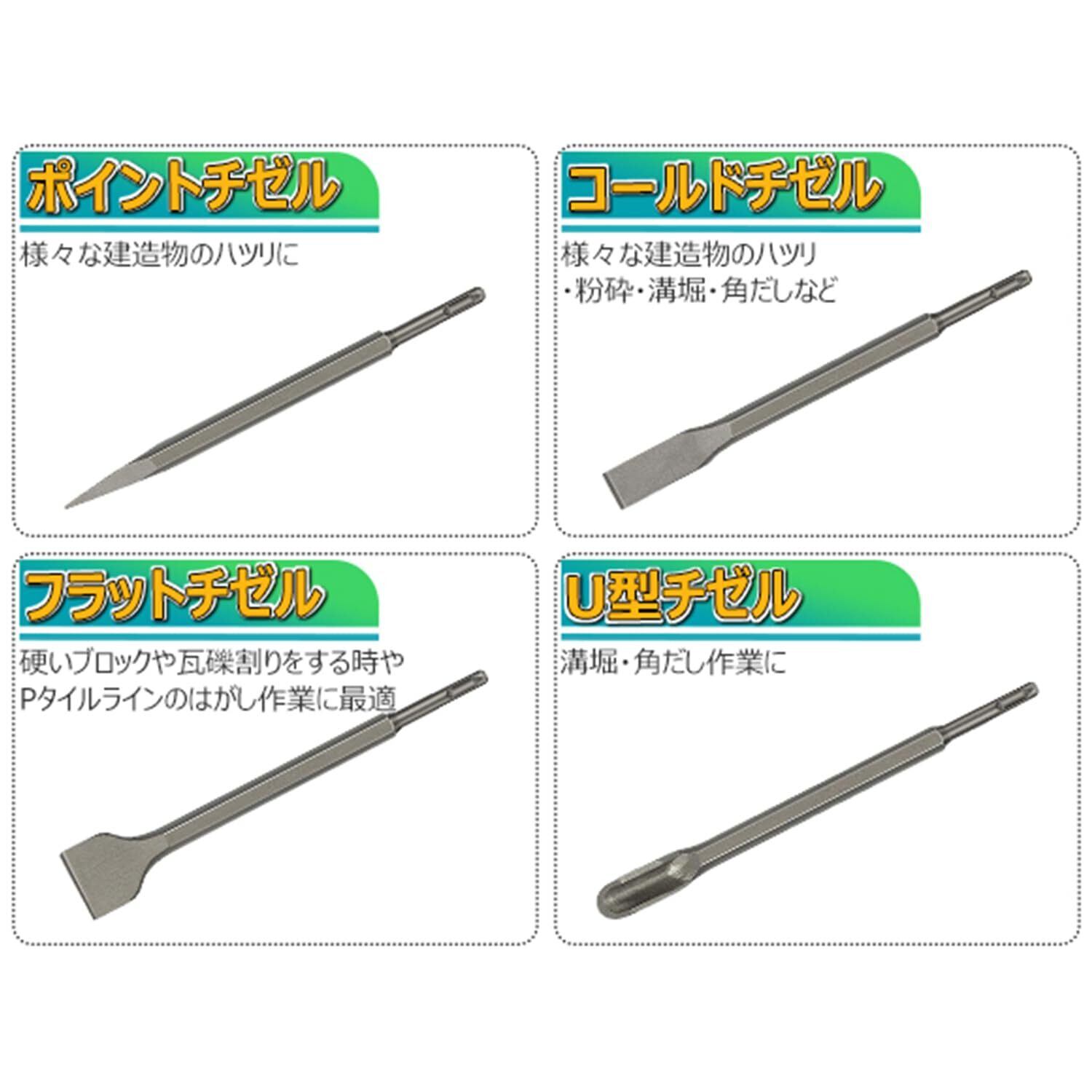 ポイントチゼル:常にパワフルな破砕力を確保しており、様々な建造物のハツリに使用が可能です。コールドチゼル:強力な粉砕力を持ち、あらゆる建造物へのハツリ・粉砕・溝堀・角出すことが可能です。フラットチゼル:硬いブロックや煉瓦割りをする時などPタイルやラインの剥し作業に最適。