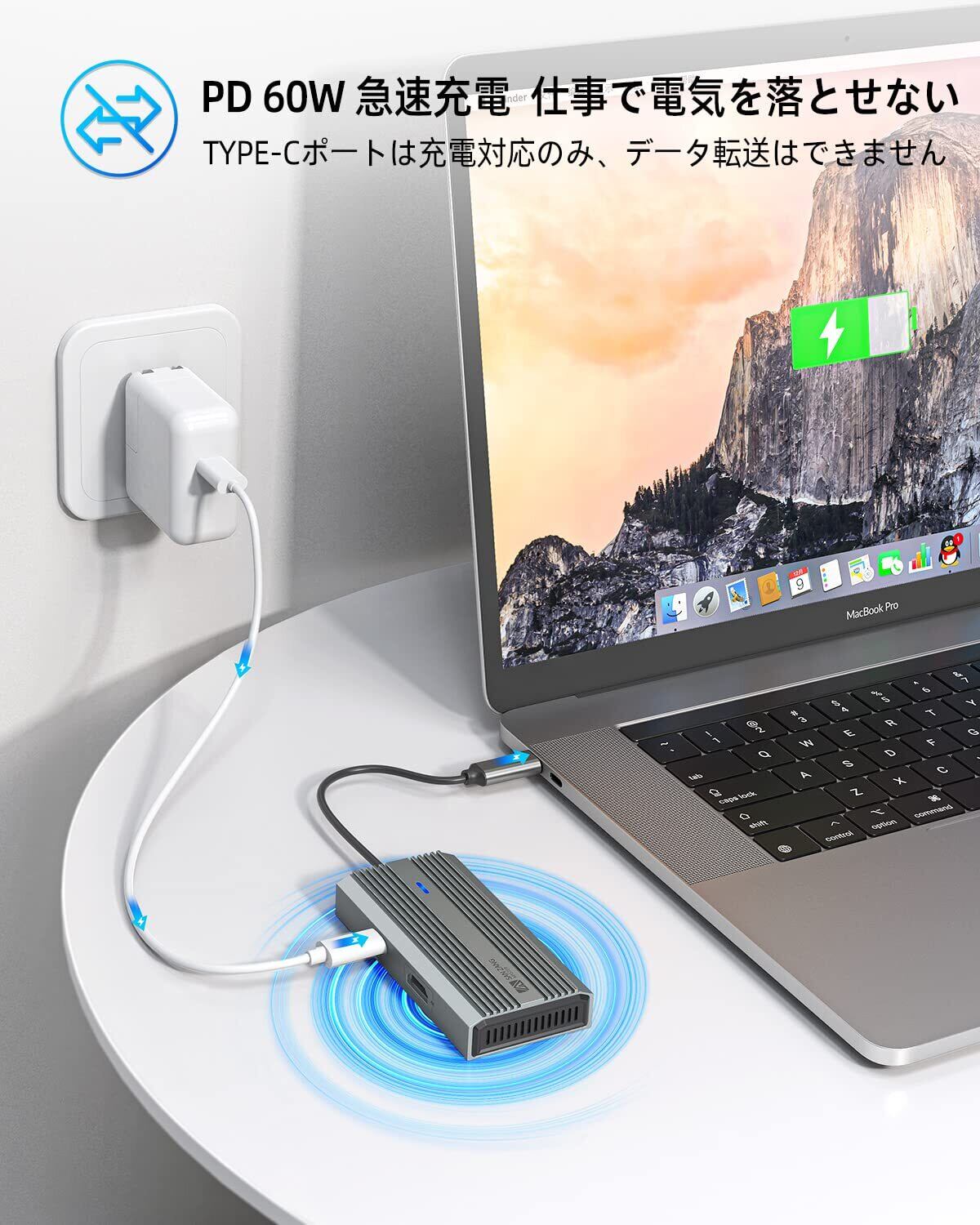 【PD 60W 急速充電】USB ハブはPD対応で最大60Wを実現します。(周辺充電機器により異なります) ※Type-C インプット(充電)には38W以上の電力が必要です。60W以上の出力可能なACアダプタ/ケーブルを推薦します。