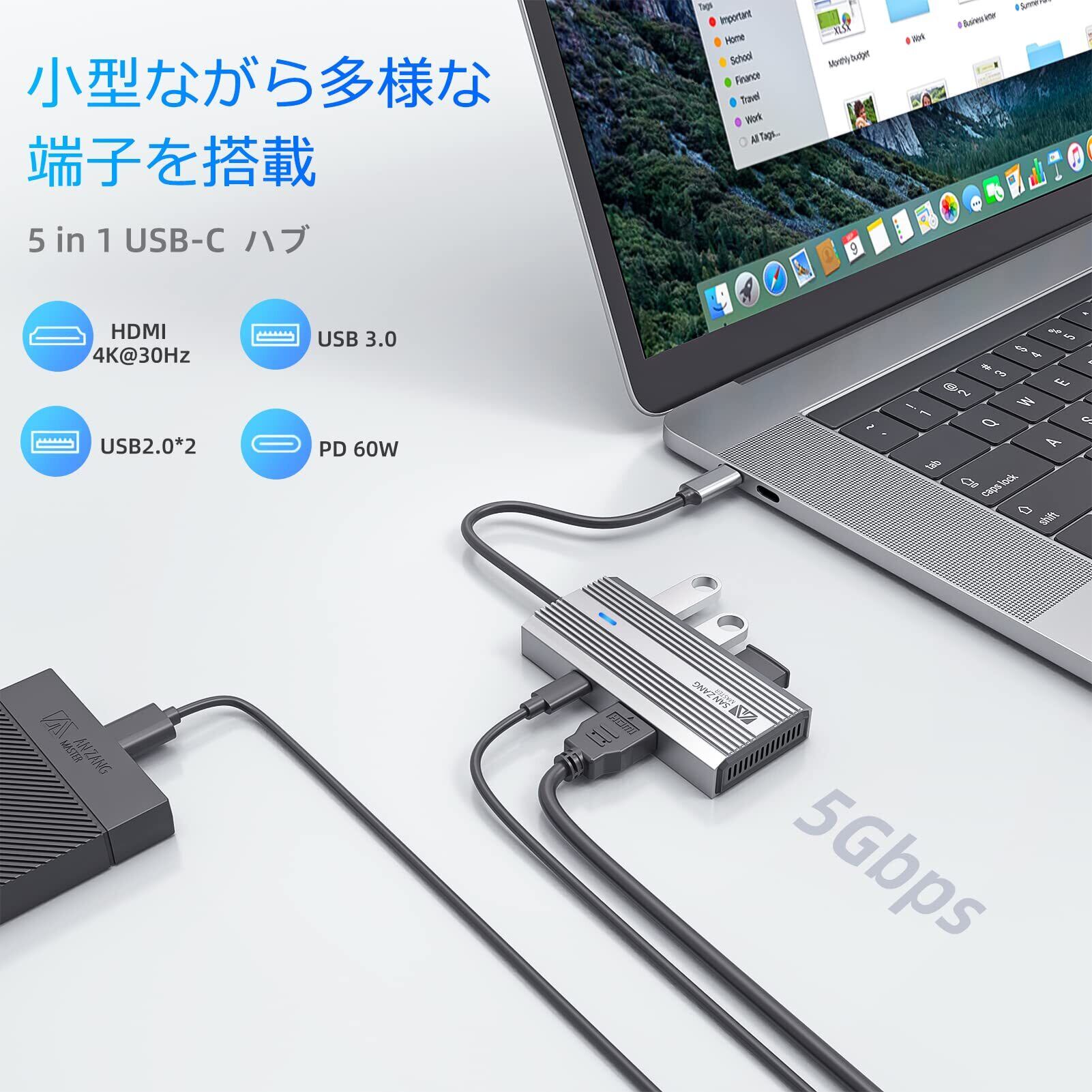 SAN ZANG MASTER USB C ハブ HDMI 4K 解像度 USB-C ハブ 5-in-1 PD充電 60W出力 USB3.0ポート搭載 5Gbps高速転送 USB2.0ポート搭載 ChromeBook/Air/iPad Pro/Type-C Laptop対応 テレワーク リモート 在宅勤務