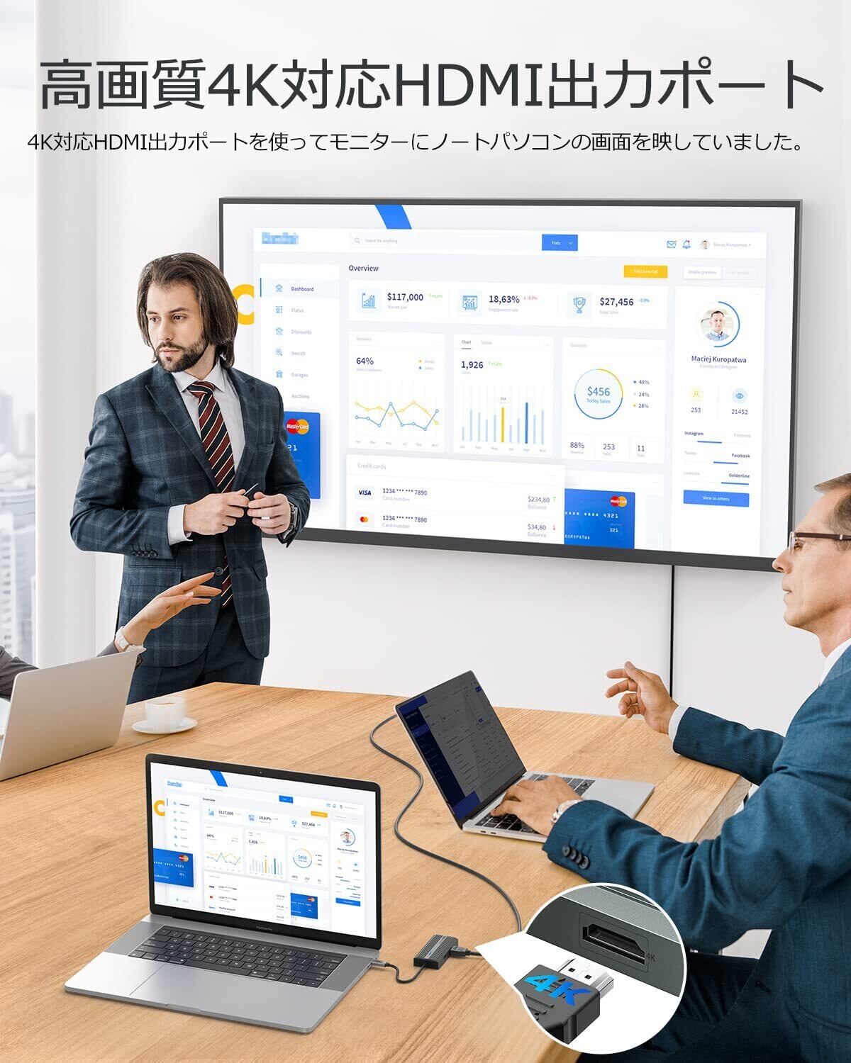 【4K大画面ディスプレイに対応】USB C ハブは最大4K @ 30Hzの解像度でHDMIモニター/ディスプレイを駆動します。(出力側Type-C機種がAlt modeに対応している必要があります) 注:HDMI 2.0バージョン以下のケーブルを使用すると、フリックが発生する場合があります。HDMIポートは、HDMI入力を備えた4K TV /モニター/プロジェクターにHDMIケーブルを接続します。スポーツイベントをストリーミングしたり、映画を観たり、大きなスクリーンで写真やアルバムを表示したり、どこでも超鮮明な視覚体験を楽しめます。Wi-Fiのキャスティングに関する問題を心配する必要はもうありません。