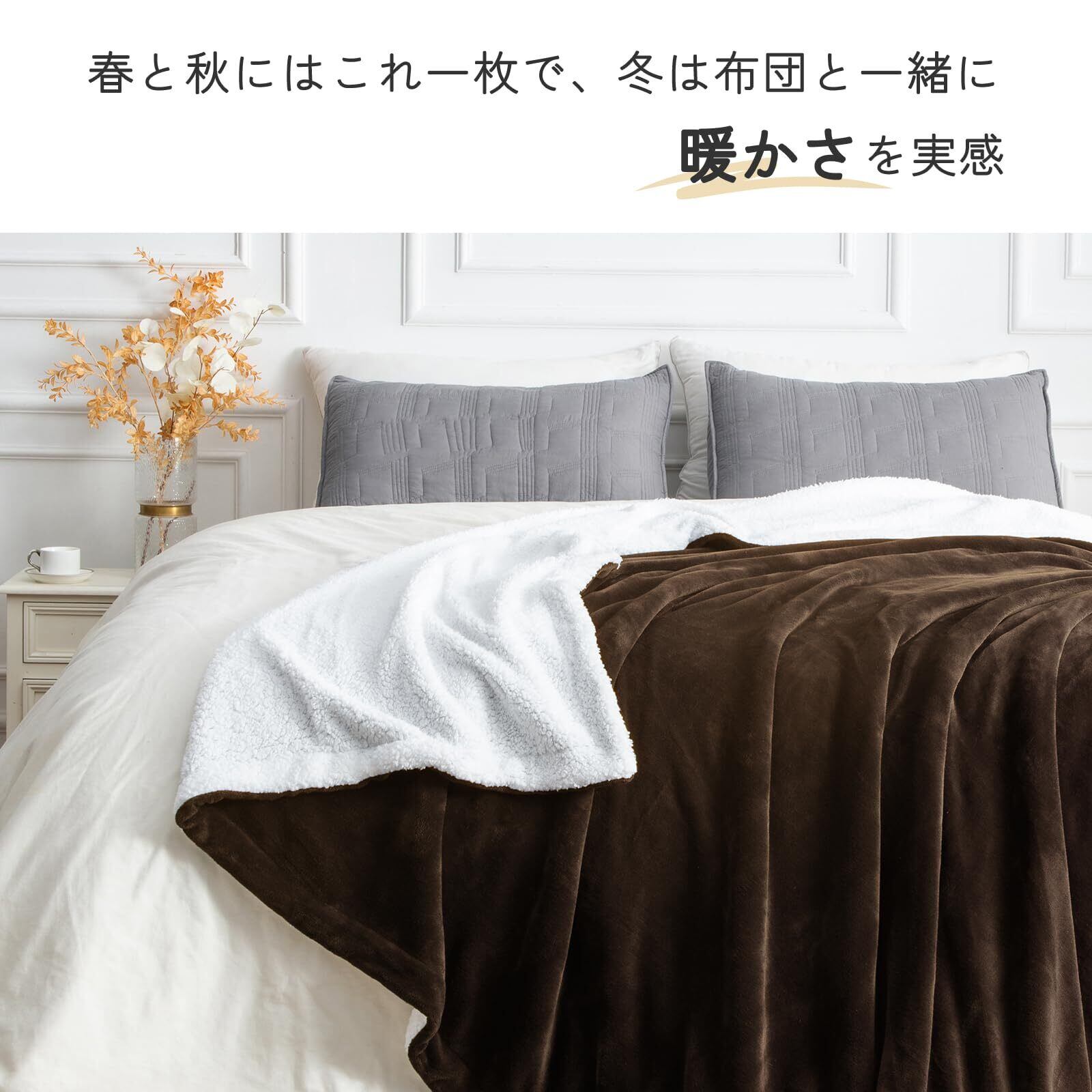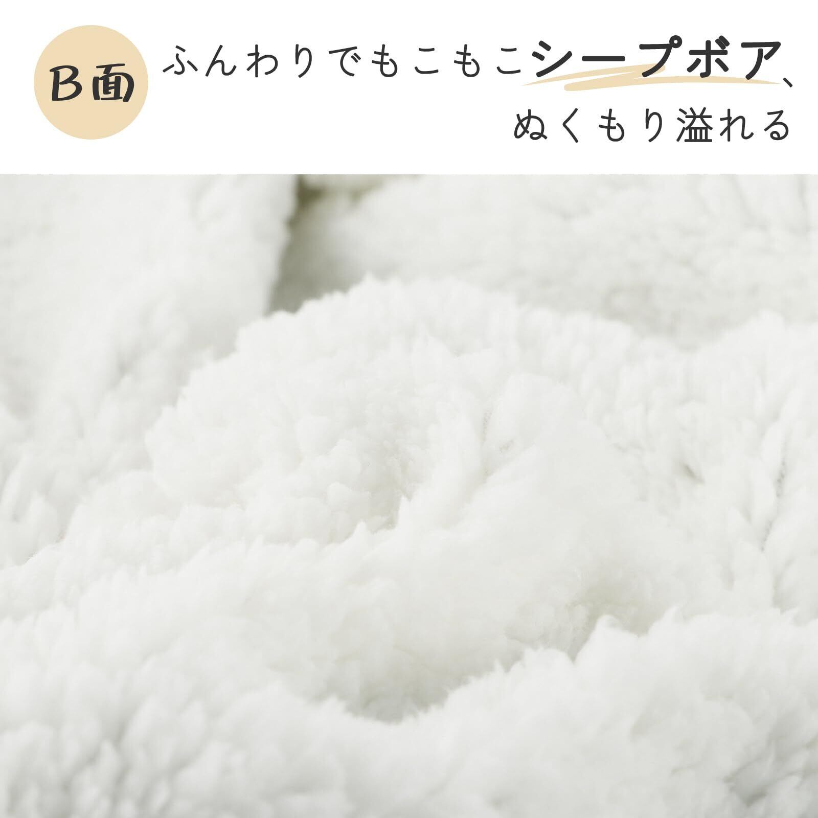 【二枚合わせあったか毛布】フランネルとシープボア、2つの異なる素材が組み合わさり、暖かさを倍増。滑らかなフランネル生地ともこももなシープ調ボア生地が、贅沢な快適さとあたたかさを一枚で提供。寒い季節に、その暖かさを感じながら、ベッドルームに更なる温かさと魅力をプラスします。