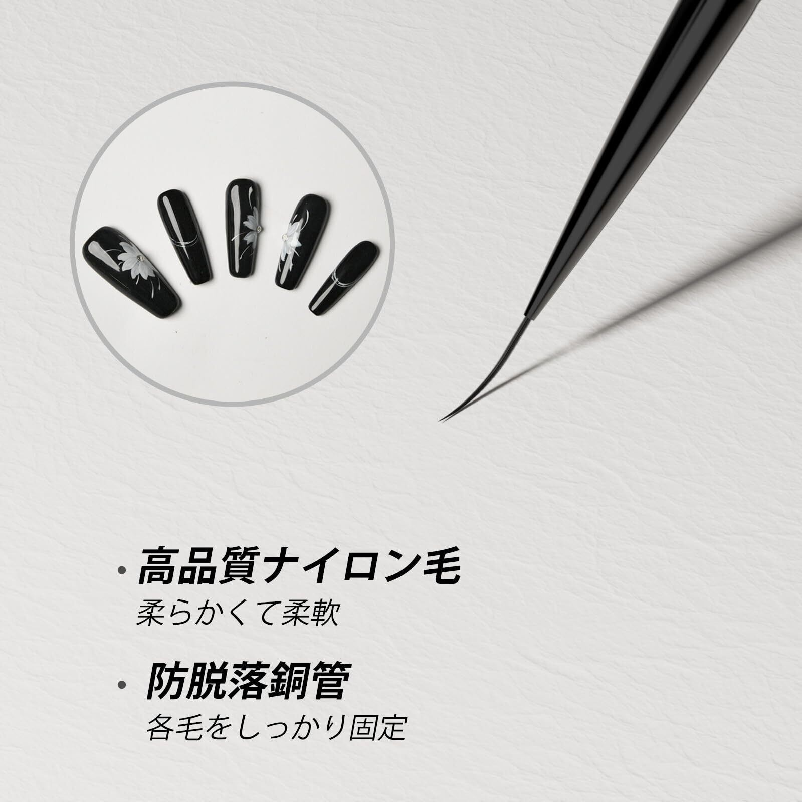 【多用途ネイルブラシセット】この5本セットには、極細ライナーブラシとドットツールがそれぞれ含まれており、細かいラインから点描まで、多様なデザインに対応できます。各ペンの前端は極細ライナーブラシ、尾端はドットツールで構成されており、異なるサイズで幅広い用途に対応します。ライナーブラシはネイル向けに選ばれた専門の日本製ナイロン繊維を使用しています。